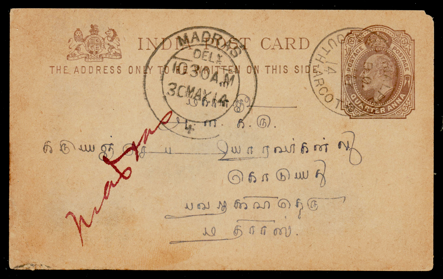 India: MUTHIALPET (sub post office of Pondicherry) cancel on 1914 (May 28) Edward ¼a postcard to Pudukottah. Scarce usage (Image) (Imageb)