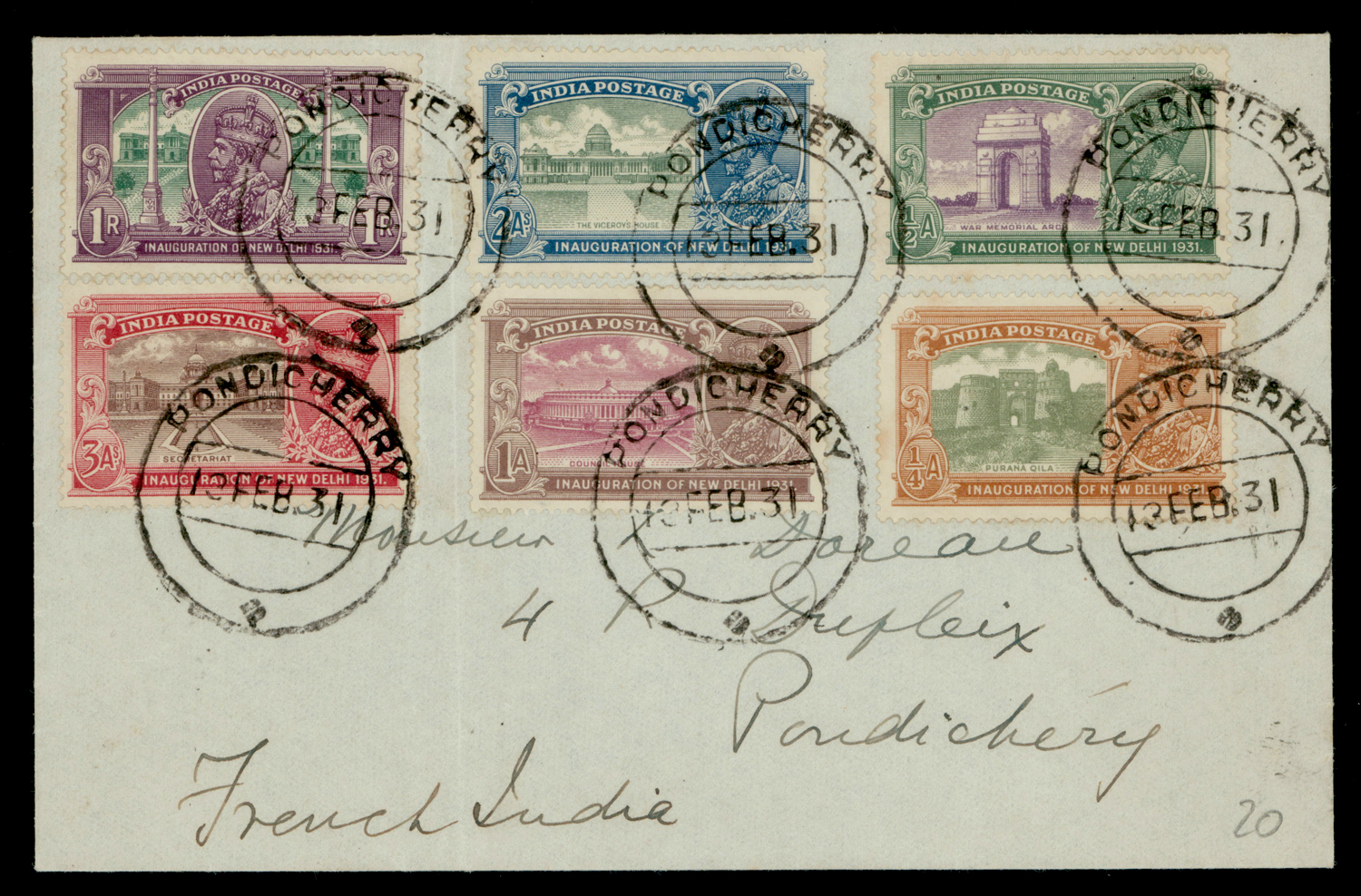India: PONDICHERRY cancels on 1931 (Feb 12) cover franked with 1931 GV Inauguration set of 6. SG 226/231 (Image) (Imageb)