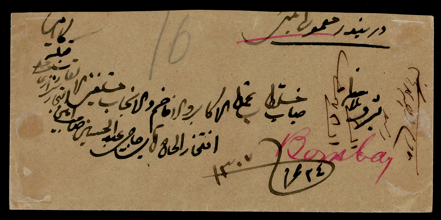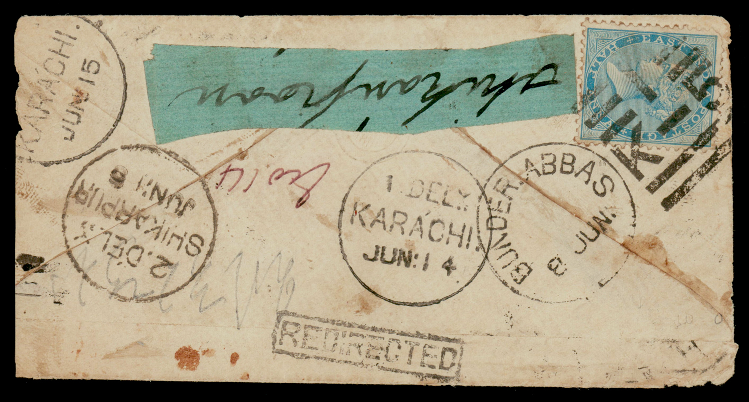 Persian Gulf: BUNDER ABBAS/1/K-5 duplex cancel on QV ½a cover to Shikarpore, redirected to Karachi (Image) (Imageb)