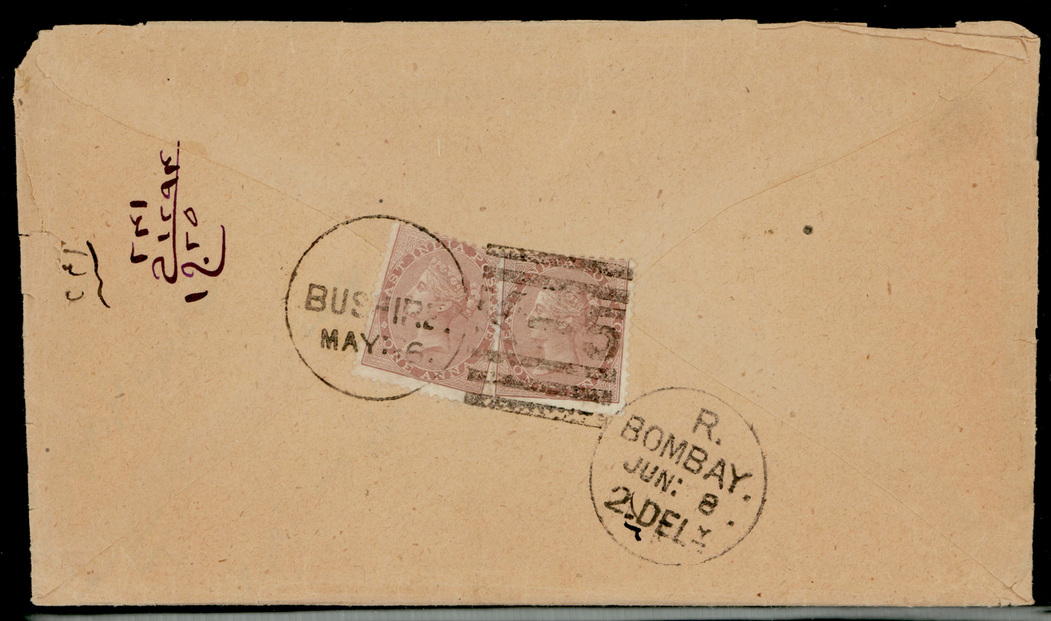 Persian Gulf: BUSHIRE/K-5 duplex cancel on cover f.w. QV 1ax2 to Bombay (Image)