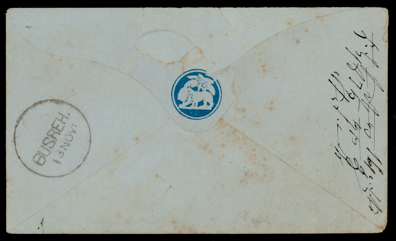 Persian Gulf: BUSHIRE/K-5 duplex cancel on 1875 QV 1a stationery to Busrah, Iraq (Image) (Imageb)