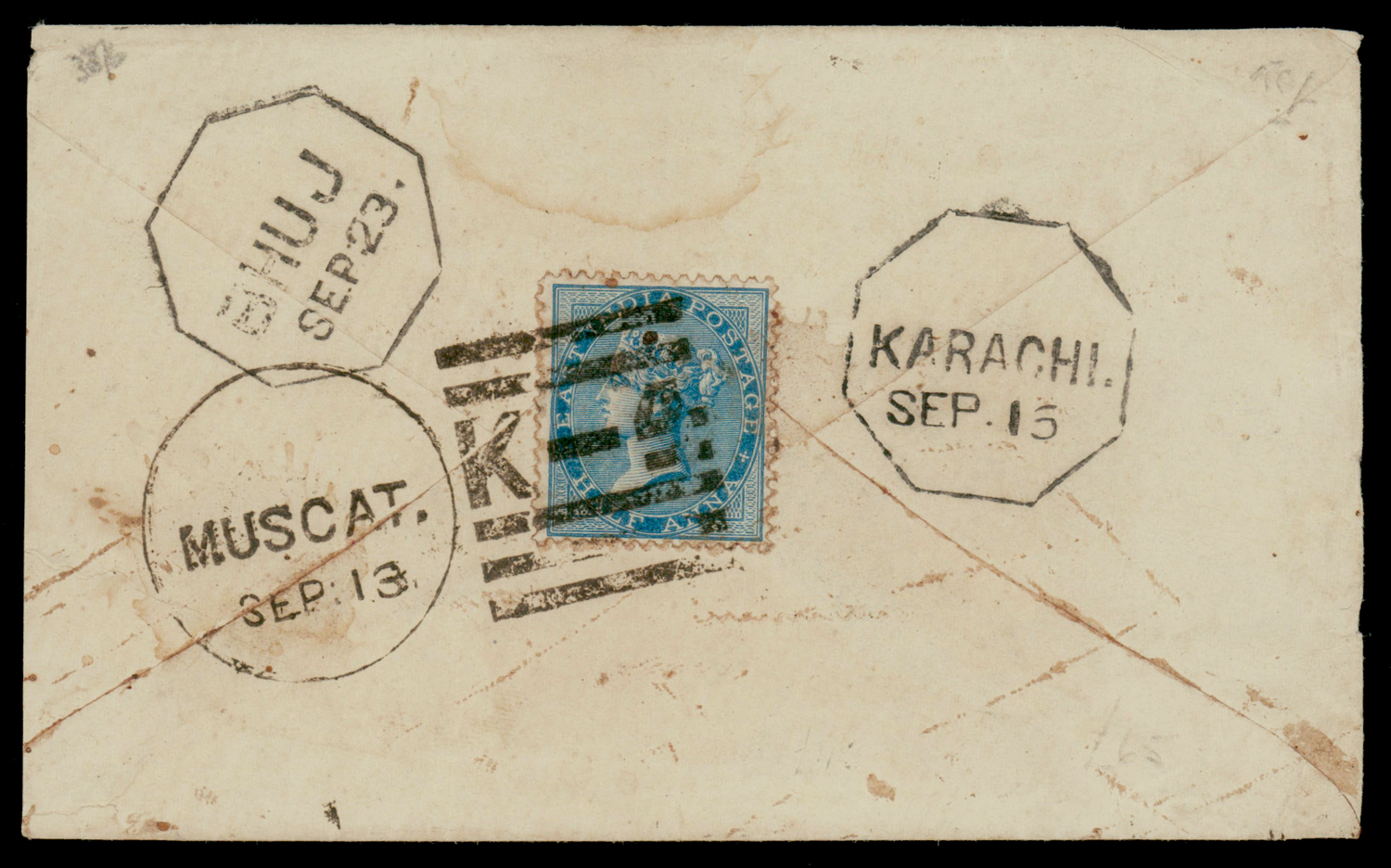 Persian Gulf: MUSCAT/K-4 duplex cancel on cover to Bhuj f.w. QV ½a, with Karachi transit (Image) (Imageb)