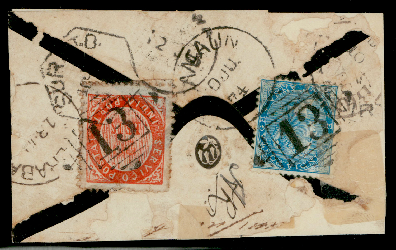 Portuguese India: 1874 part cover from Damaun f.w. India QV ½a + Portuguese India 20R, each tied by "13" in diamond of bars within rectangle, with a variety of transit and delivery cancels (Image)