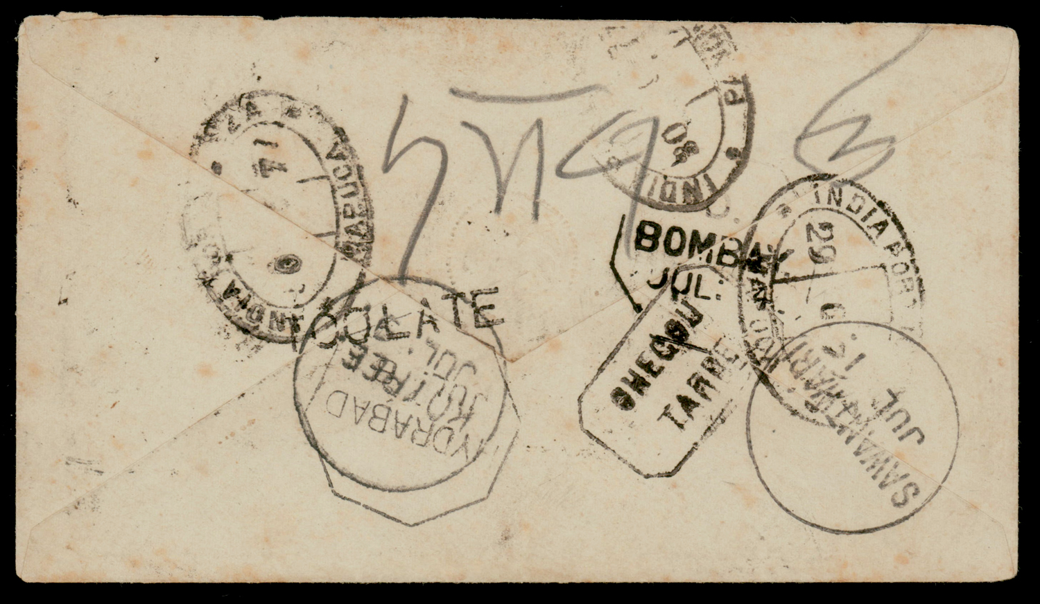 Portuguese India: "2" in oval of bars on India QV ½a stationery used 1877 (Jun 29) from Mapuca to Kotree, with Sawantwaree, Bombay and Hyderabad transits, unframed TOO LATE and Kotree delivery. The mail passed through the system without