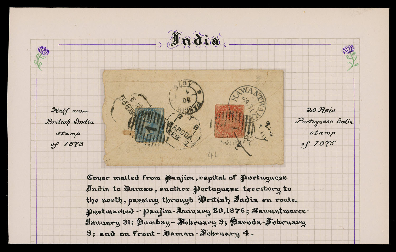 Portuguese India: 1876 combination cover from Panjim to Daman, passing through British territory, hence Indian adhesive applied, with Panjim (Jan 30), Sawantwaree (Jan 31), Bombay G.P.O. (Feb 3), Bombay-Baroda railway (Feb 3) and