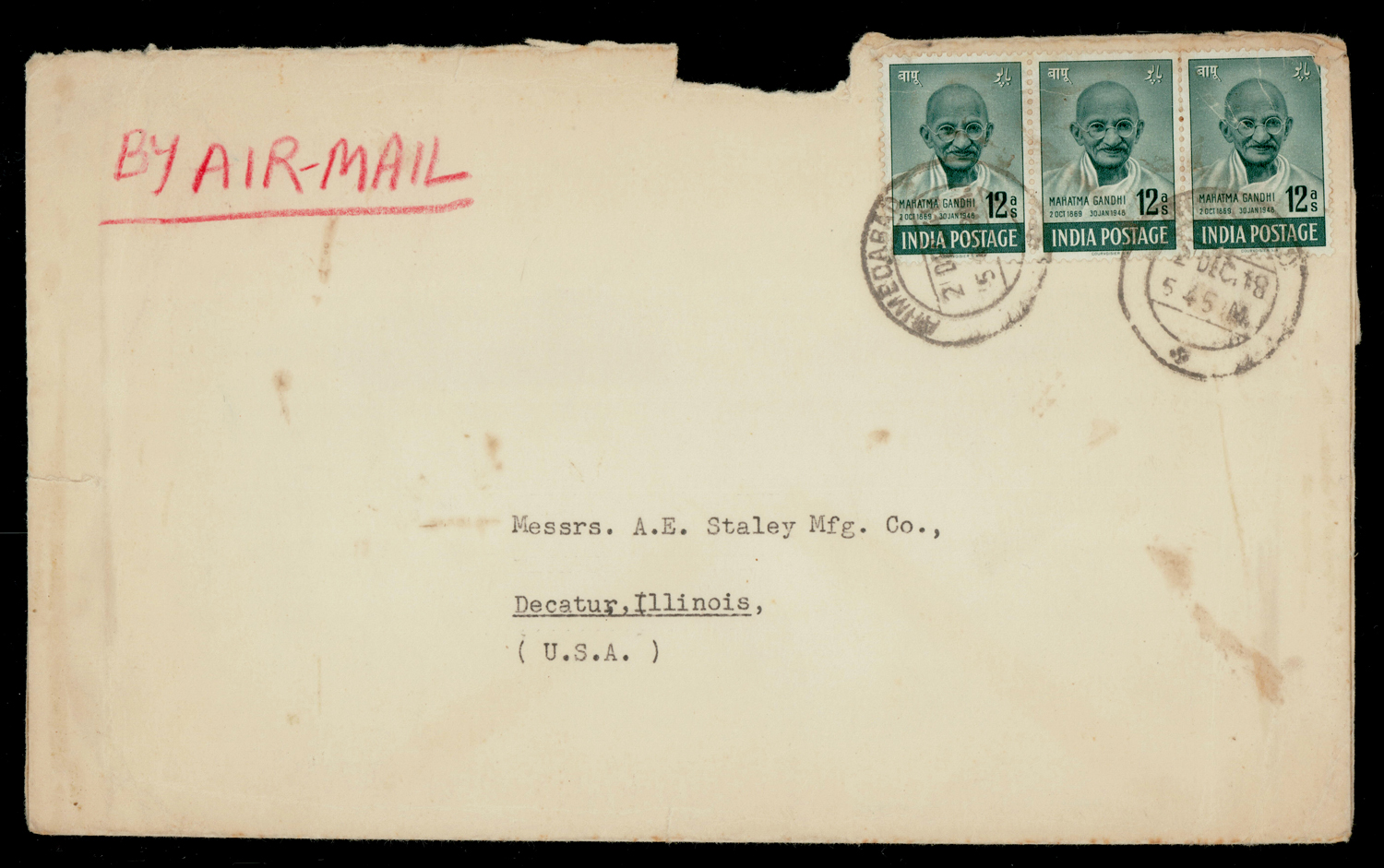 JAI HIND bilingual slogan x 7 cancels on airmail cover f.w. multiple GVI stamps totaling 36as, from Madras G.P.O. to USA, with MADRAS SORTING H.Q./LETTER MAIL …" (Image) (Imageb)