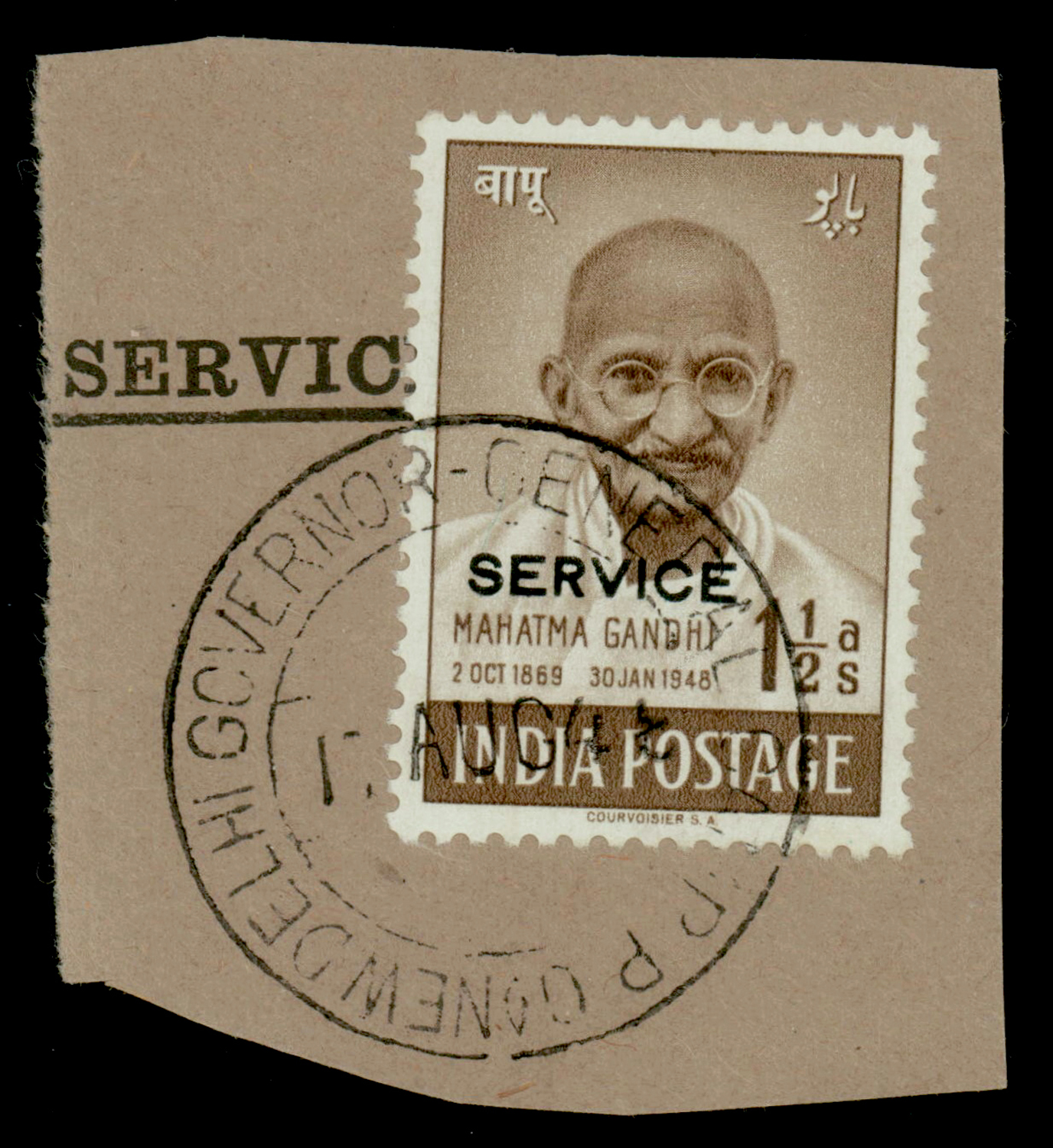 Gandhi 3½a overprinted SERVICE used on piece, cancelled "RASHTRAPATI BHAVAN P.O. / NAI DILLI 4 / 14 OCT 52" (native hindi cancel) cds. The Gandhi Service stamps were intended for use by the