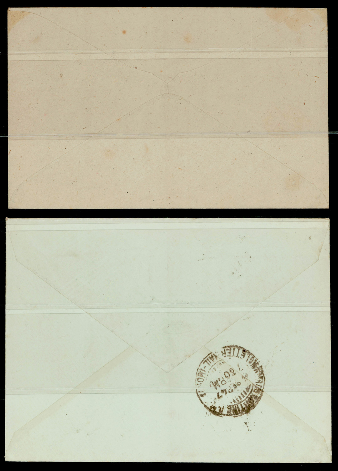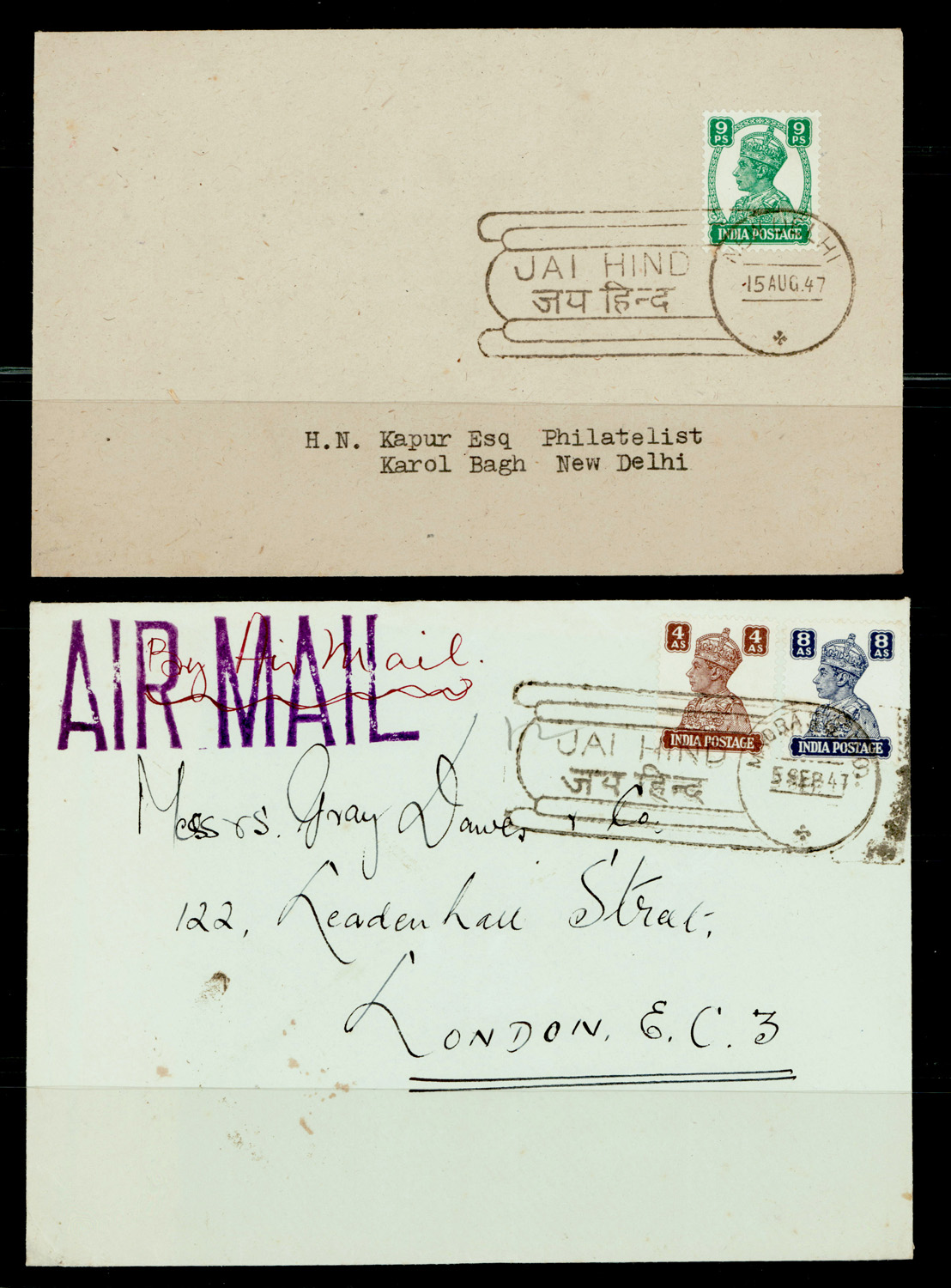 HIND slogan cancel of NEW DELHI 15 August on cover. Another cover addressed to London with slogan cancel of MADRAS G.P.O. 5 September with sorting office cds on reverse. (Image) (Imageb)