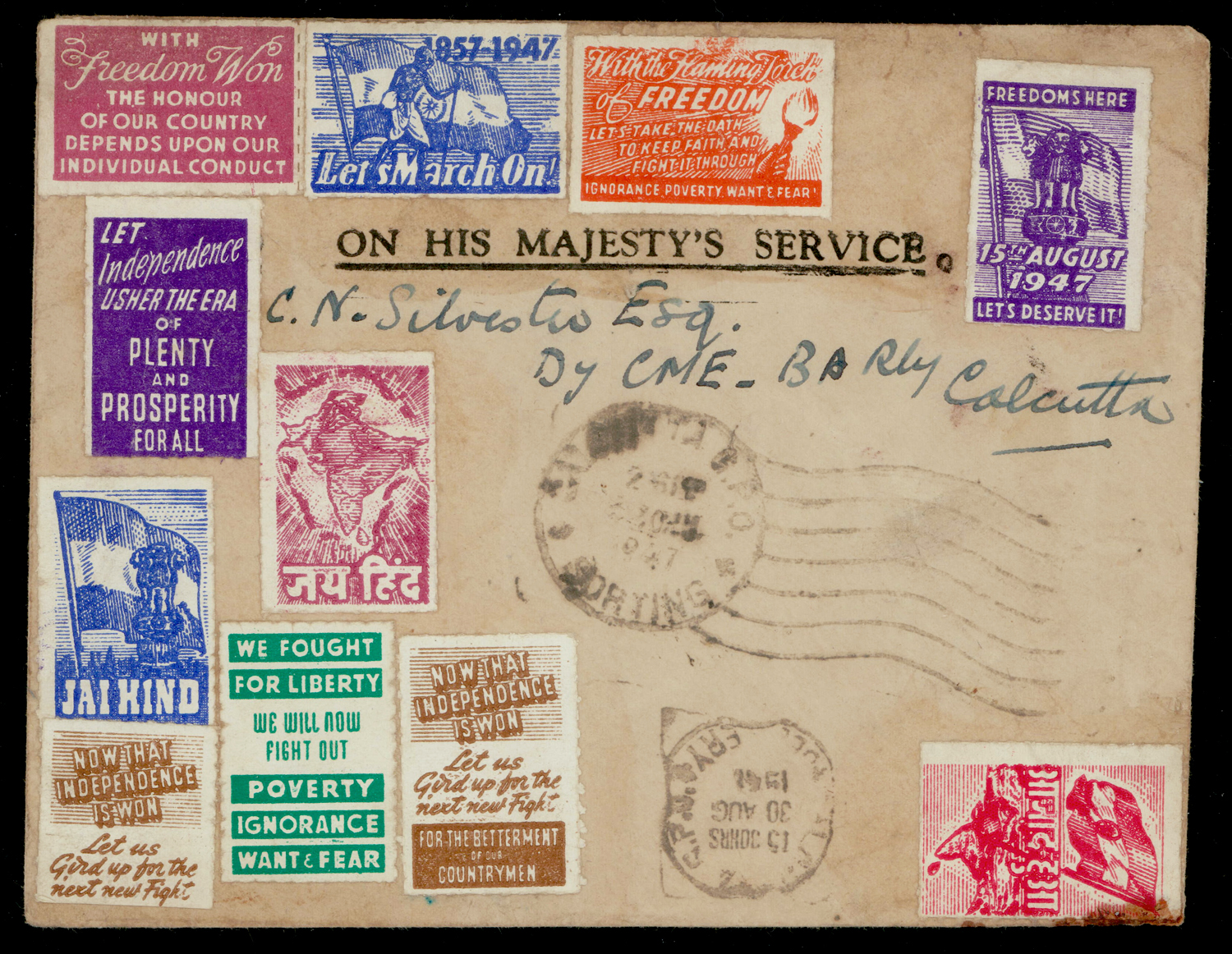 Hind labels x 11 varieties on (Aug 30) Official cover addressed to Calcutta with delivery cds alongside. A philatelic creation (Image) (Imageb)
