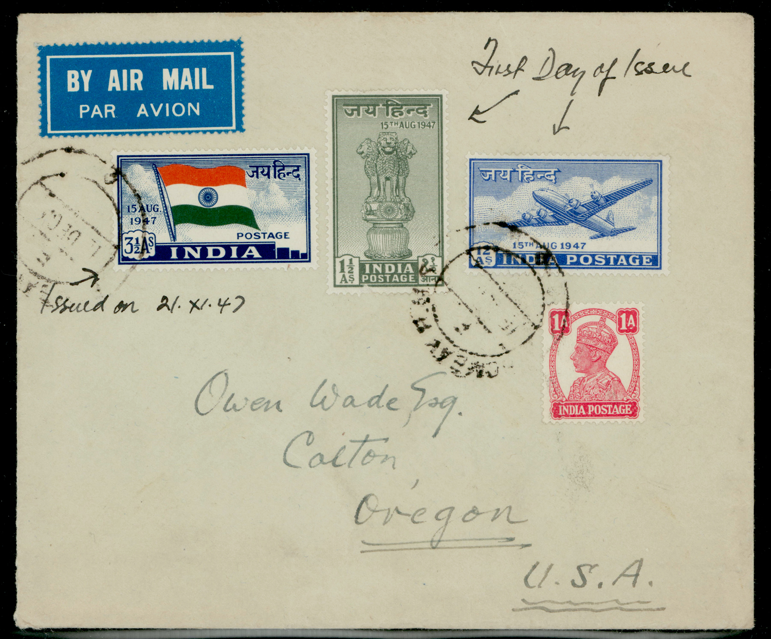 Jai Hind complete set + GVI 1a on First Day Cover from Bombay G.P.O. to USA, with letter stating "Today the new issues of Indian Stamps start. Together with the one issued on 21st Nov. 1947 - the 3½ as - the