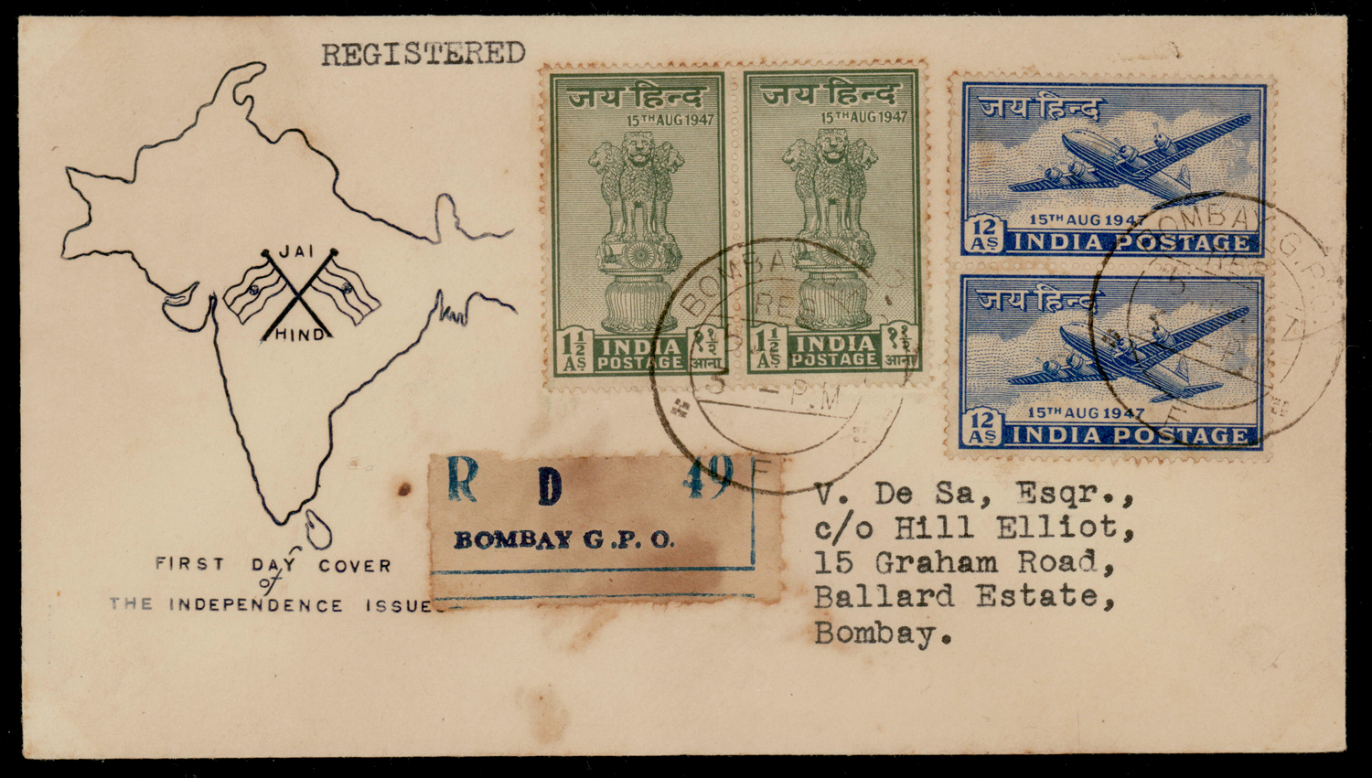 Jai Hind 1½a + 12a pairs on Private registered First Day Cover, depicting India Map & Flag, from Bombay G.P.O. to Ballard Estate, with delivery cds on reverse