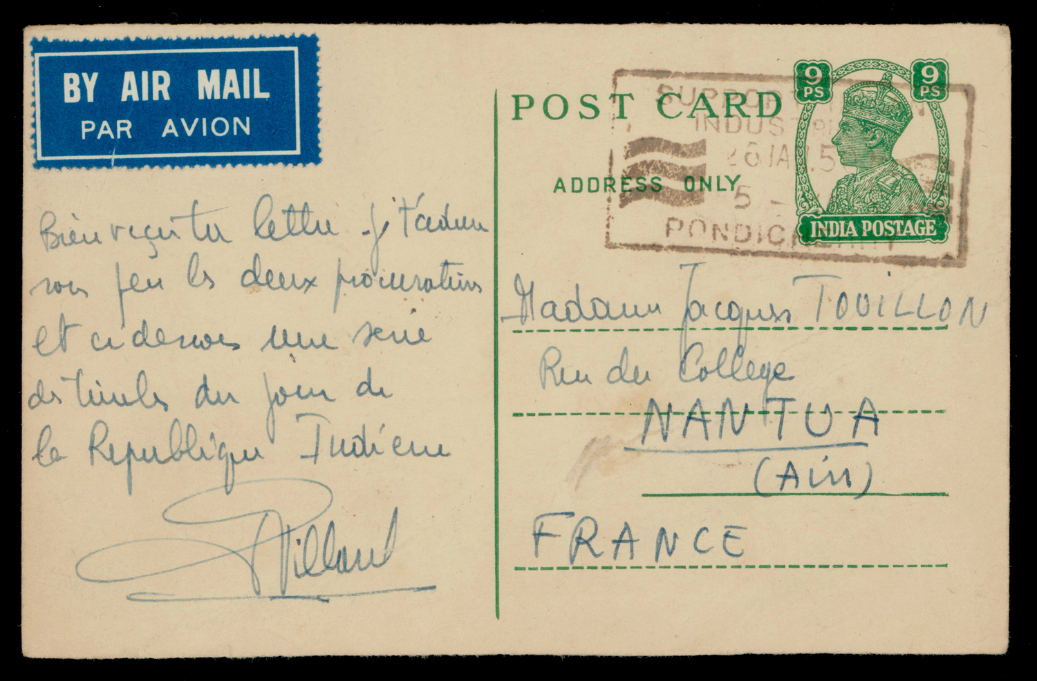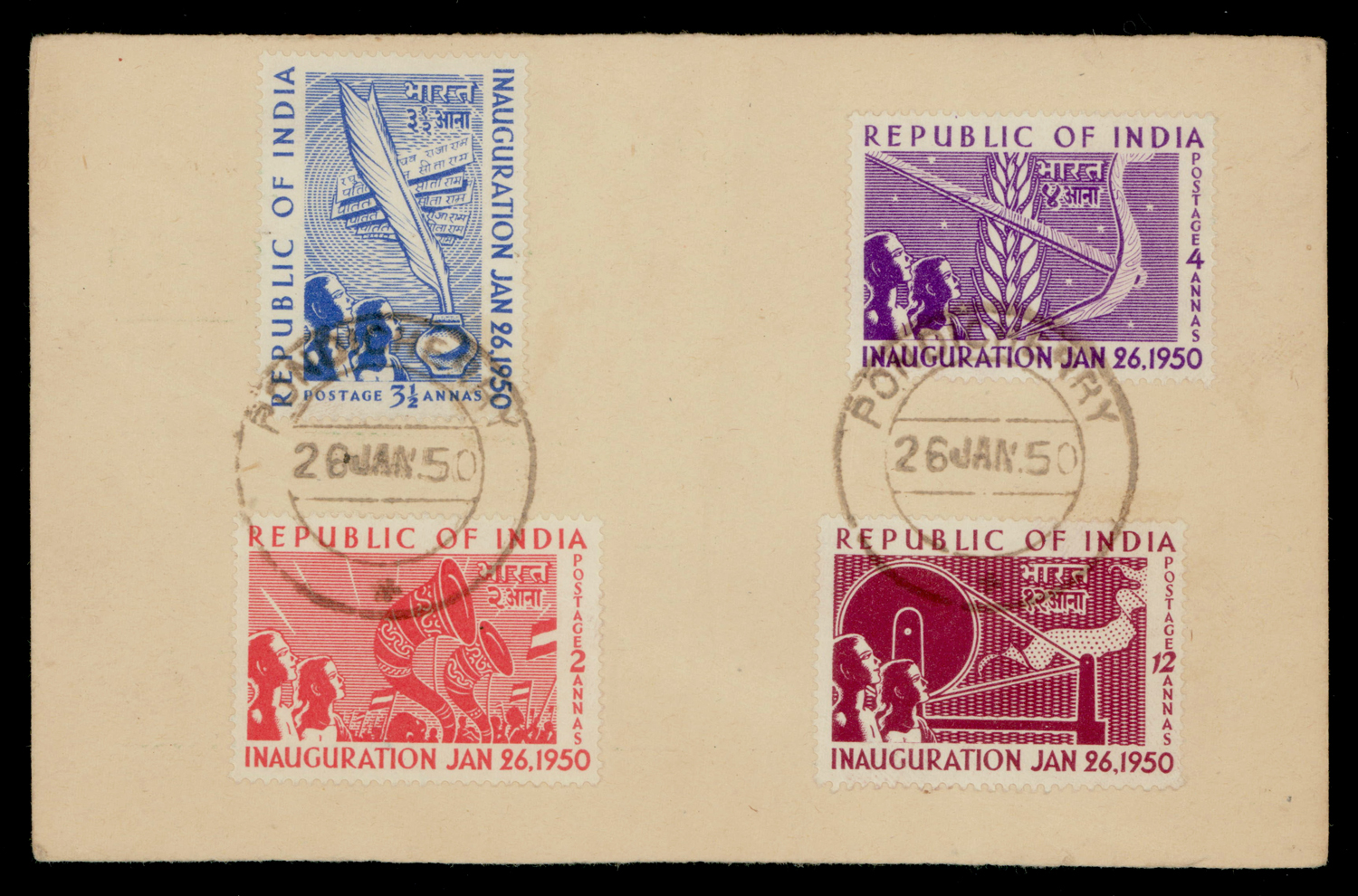 Republic First day cancels on complete set on GVI 9p postcard, used from Pondicherry (Image) (Imageb)