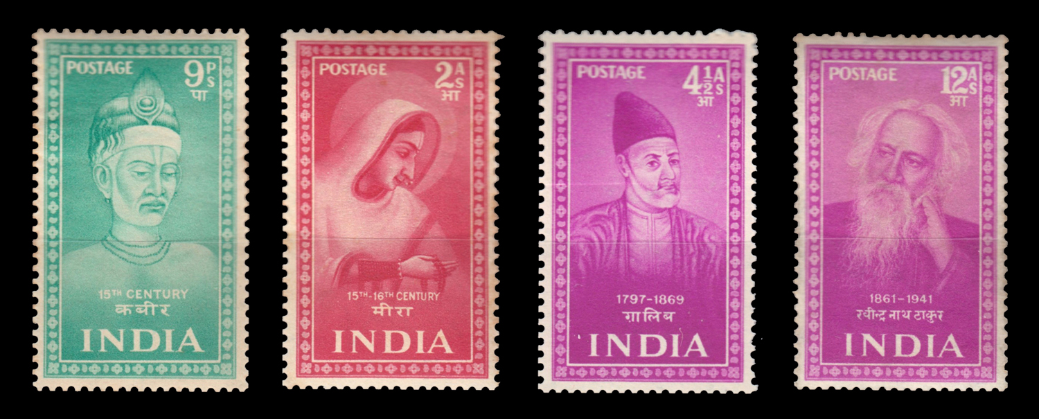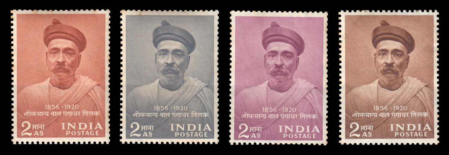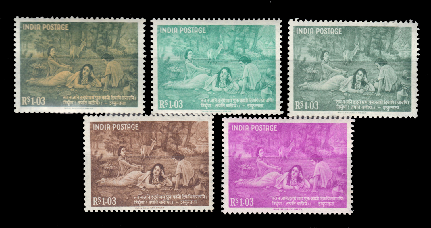 Kalidasa Poet Shakuntala, 4 different perforated olor trials along with issued stamp, toned gum, scarce. SG 428 CT (Image)