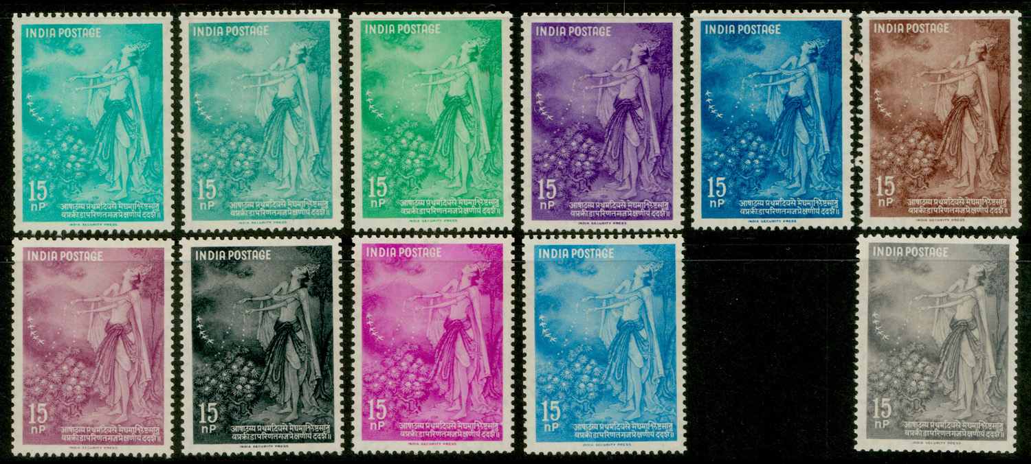Kalidasa Poet Yaksha-meghduta 10 different perforated color trials on Ashoka upright watermark paper, MNH, with produced stamp for comparision. SG 427 CT