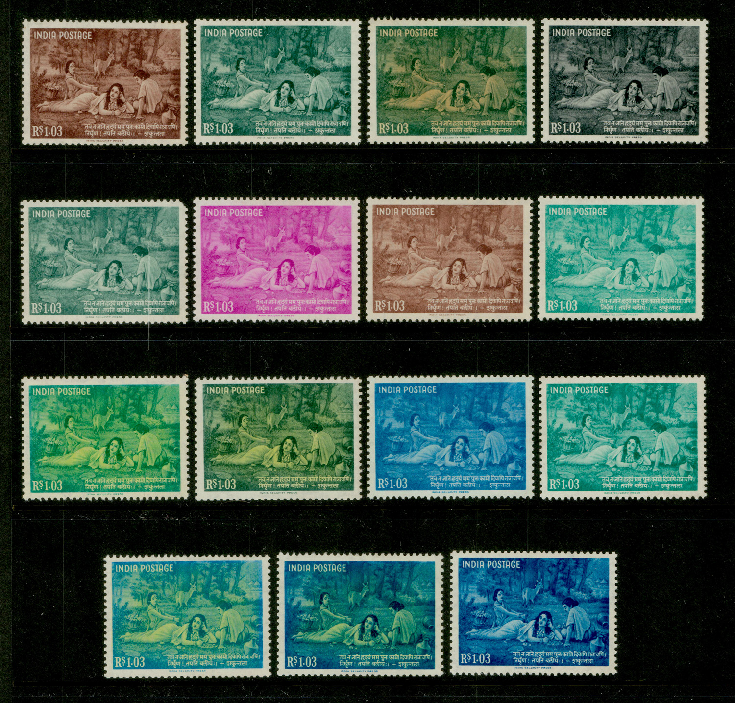 Kalidasa Poet Shakuntala, 15 different perforated color trials on Ashoka sideways watermark paper, MNH. SG 428 CT (Image)