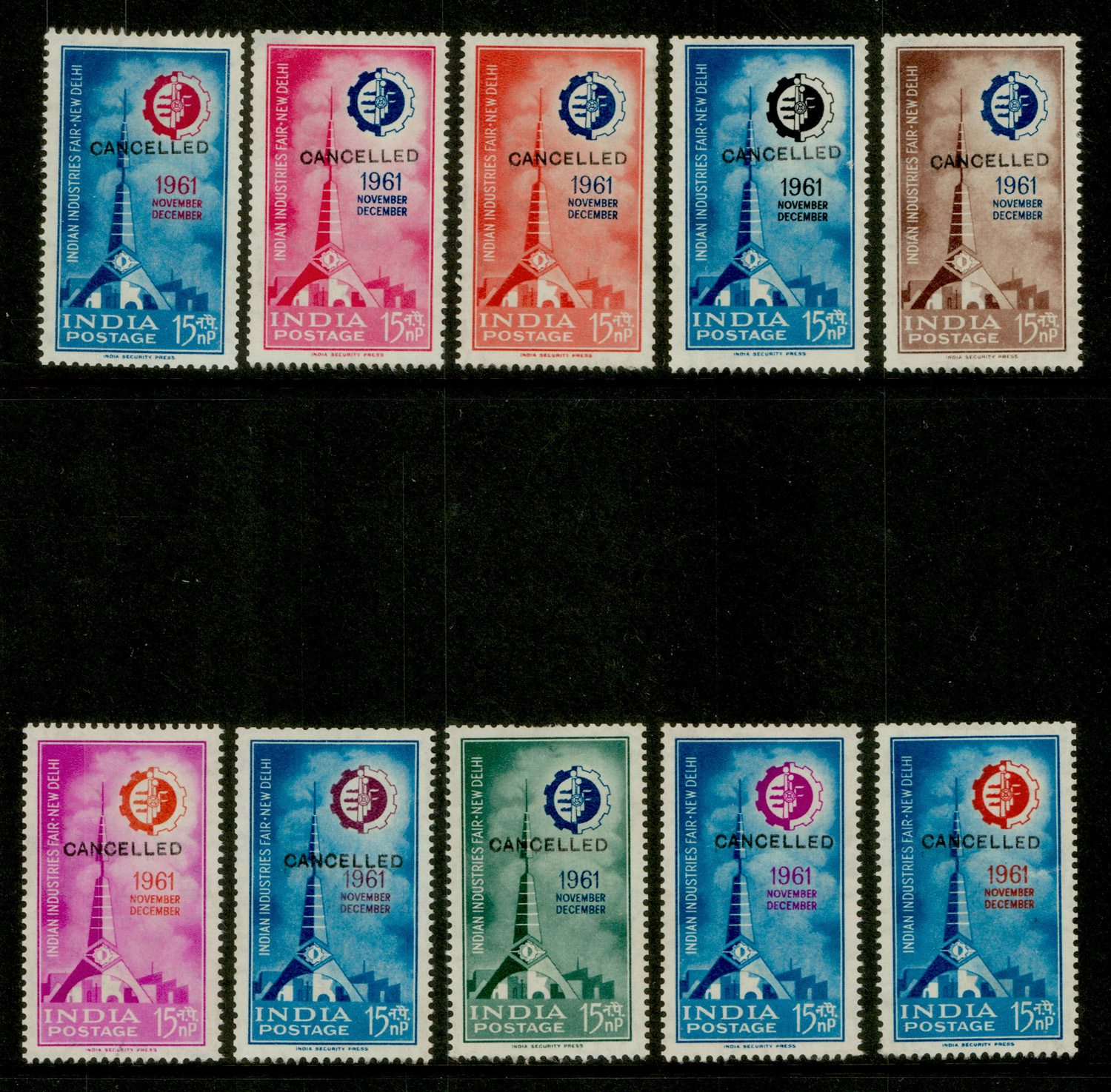 Emblem, Exhibition gate 10 different perforated color trials on Ashoka upright watermark paper, each overprinted CANCELLED, MNH. SG 444 (Image)