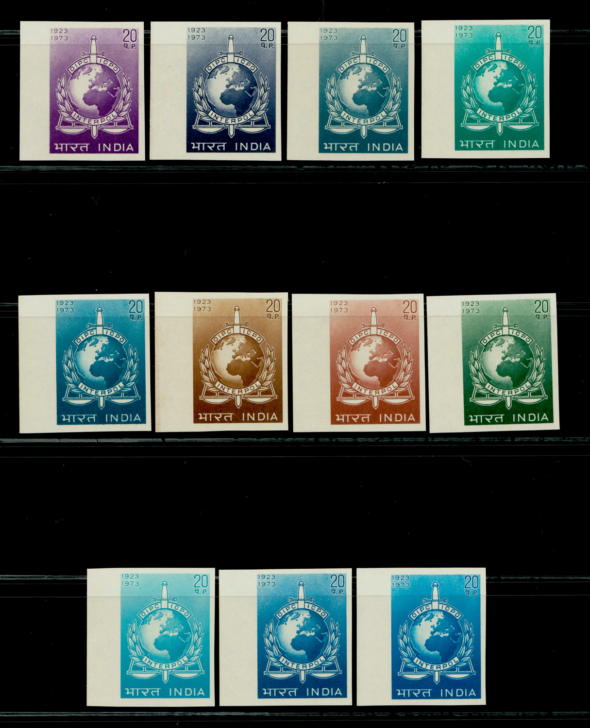 Anniversary of Interpol 20p imperforate color trials in 11 different colors, MNH. SG 698CT (Image)