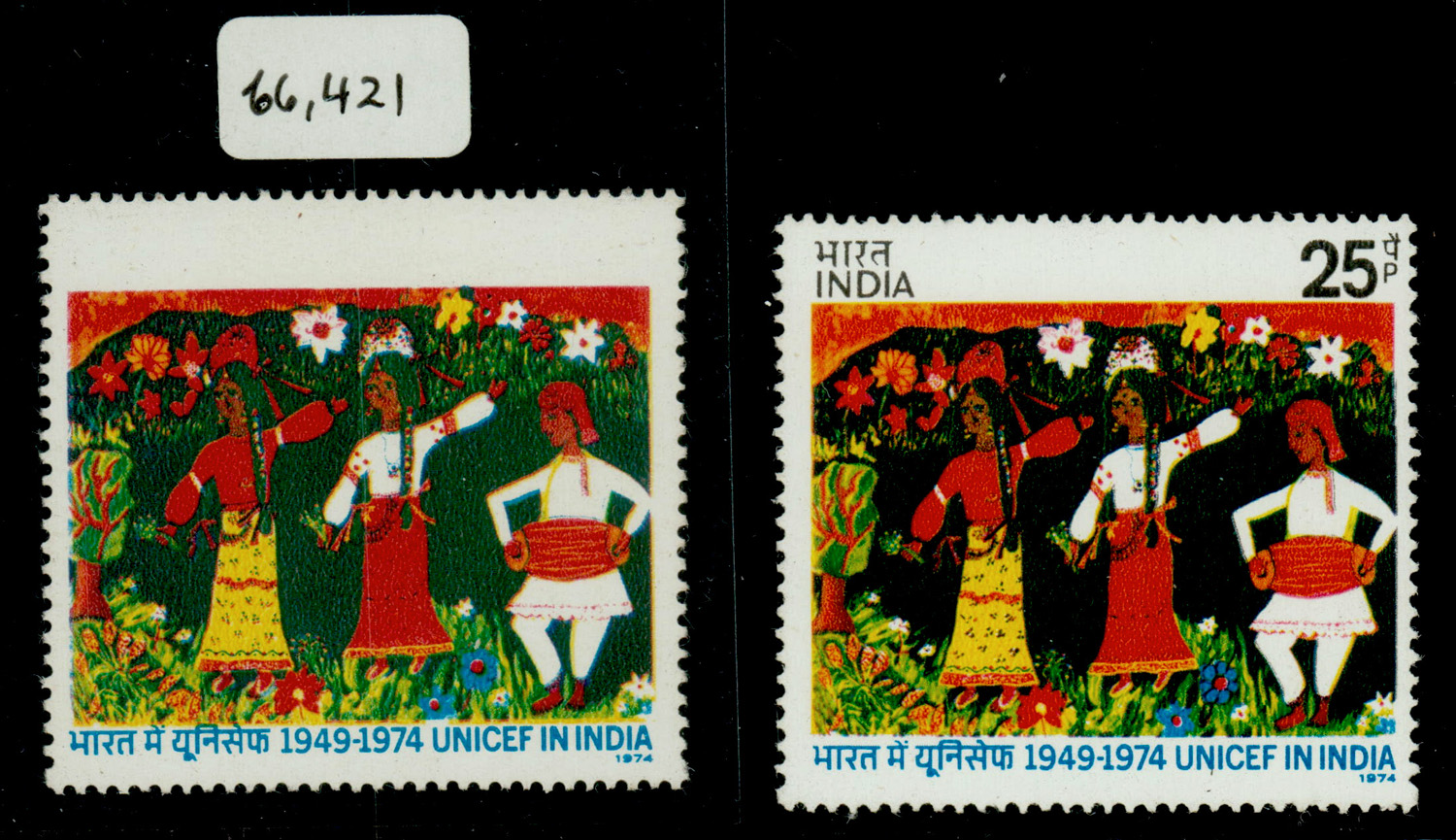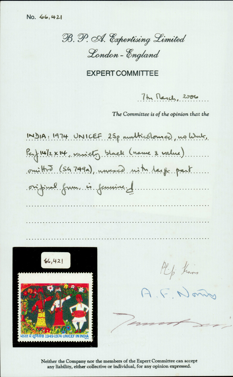 Indian Dancers, variety: black (name & value) omitted, mint, with normal for comparision. SG 749a. 2006 BPA certificate (Image) (Imageb)