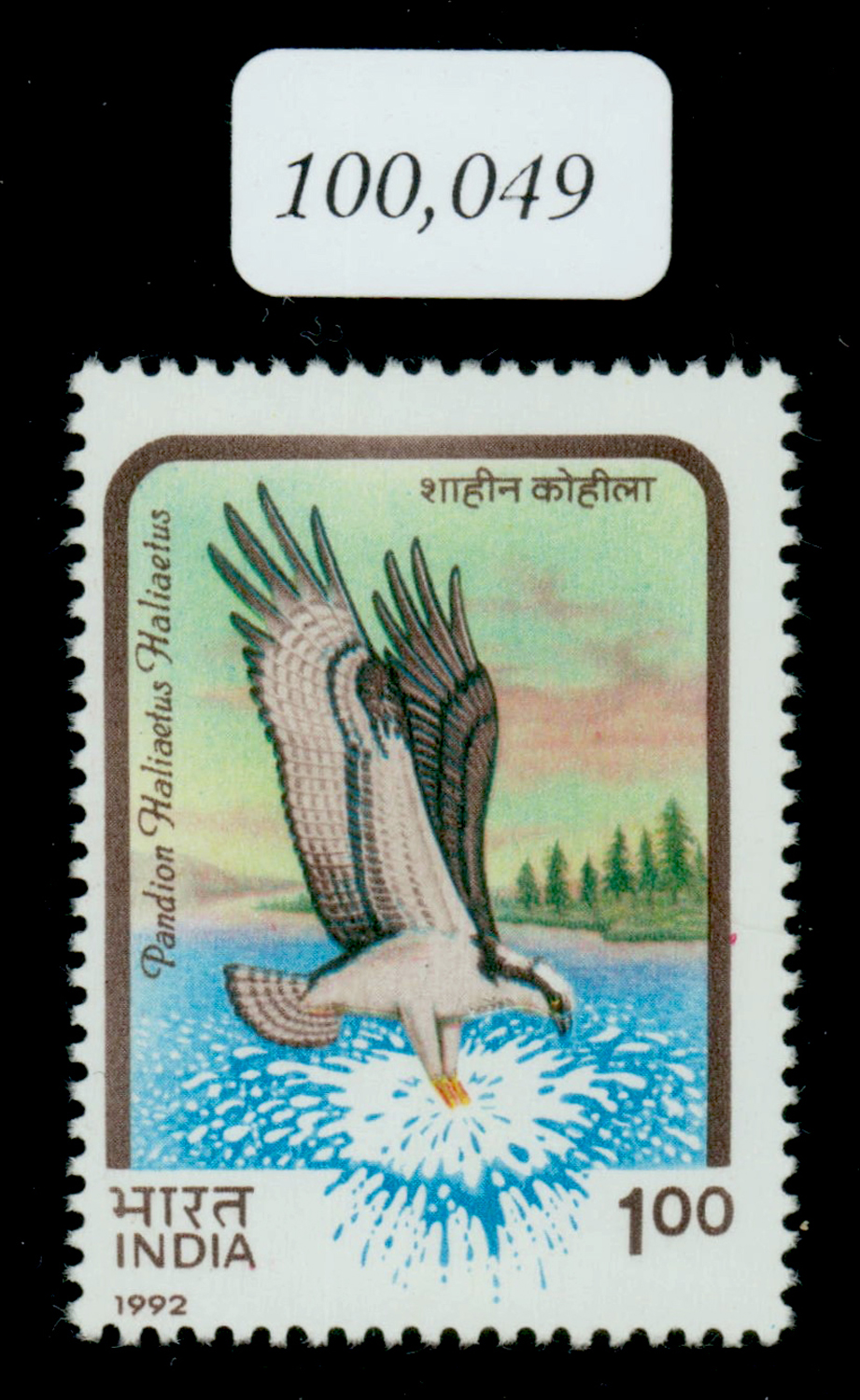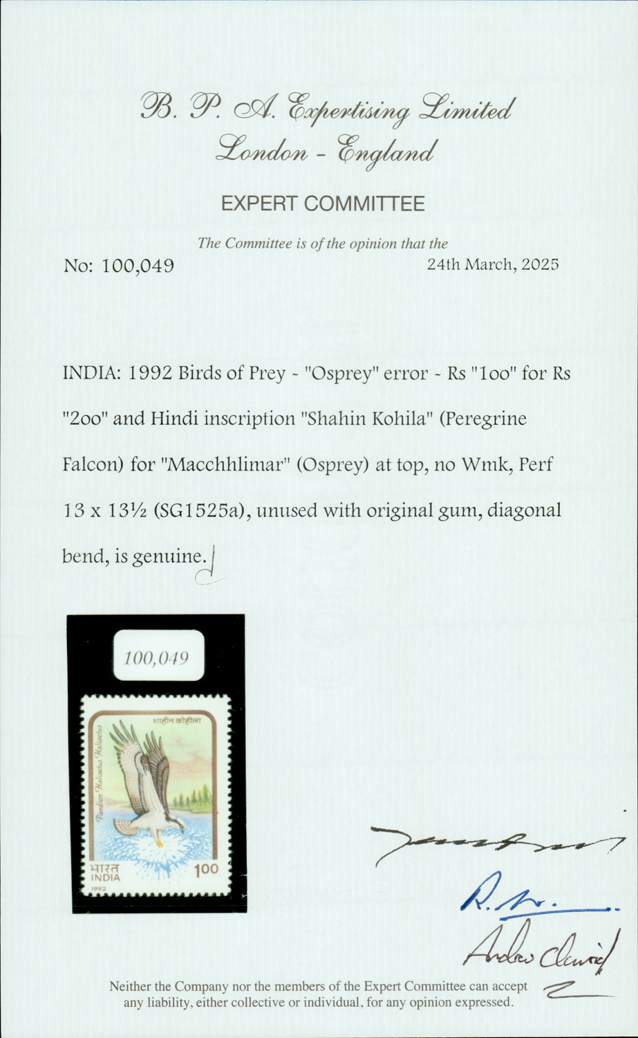 Prey "Osprey" error, Rs "1" for Rs "2" and hindi inscription "Shahin Kohila" (Peregrine Falcon) for "Macchhlimaar" (Osprey) at top, MNH. SG 1525a £3,500 (Image) (Imageb)