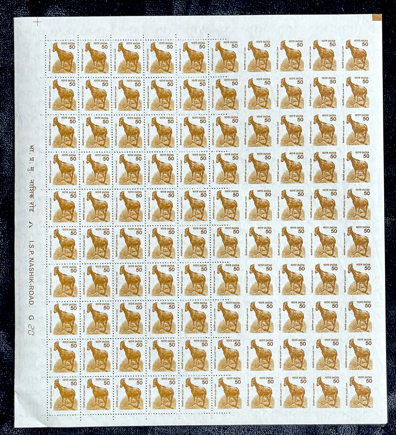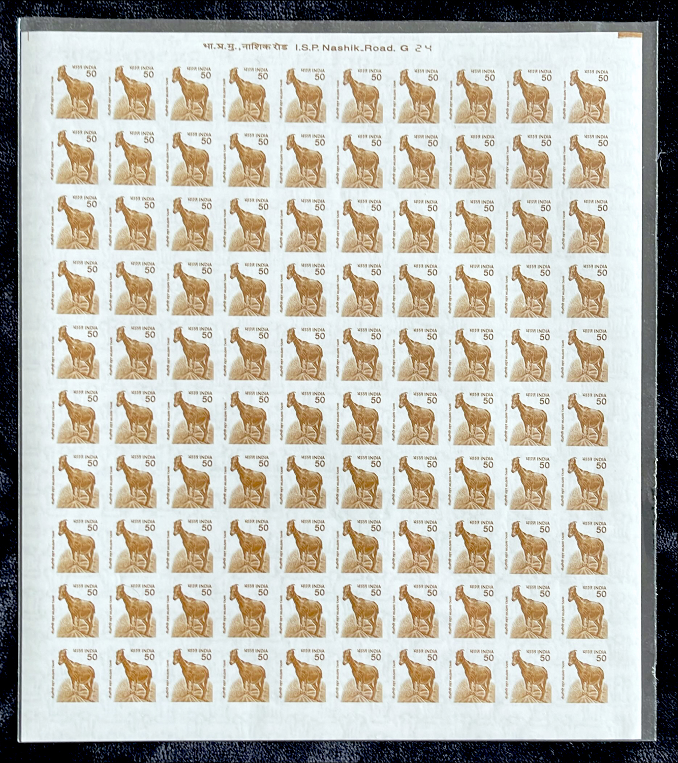 Wildlife Nilgiri Tahr 50p complete sheet/100, variety: partially imperforate, MNH. SG 1924var (Image) (Imageb)