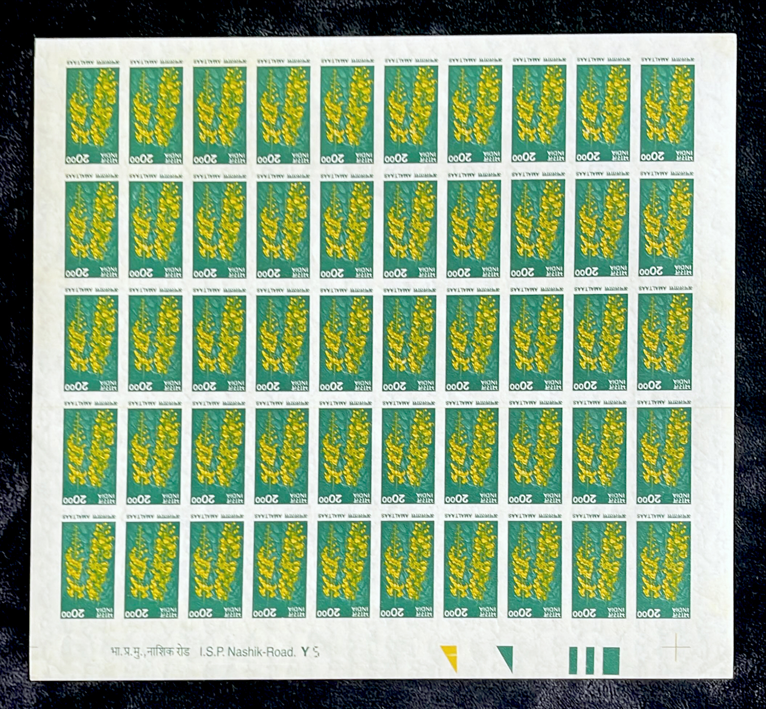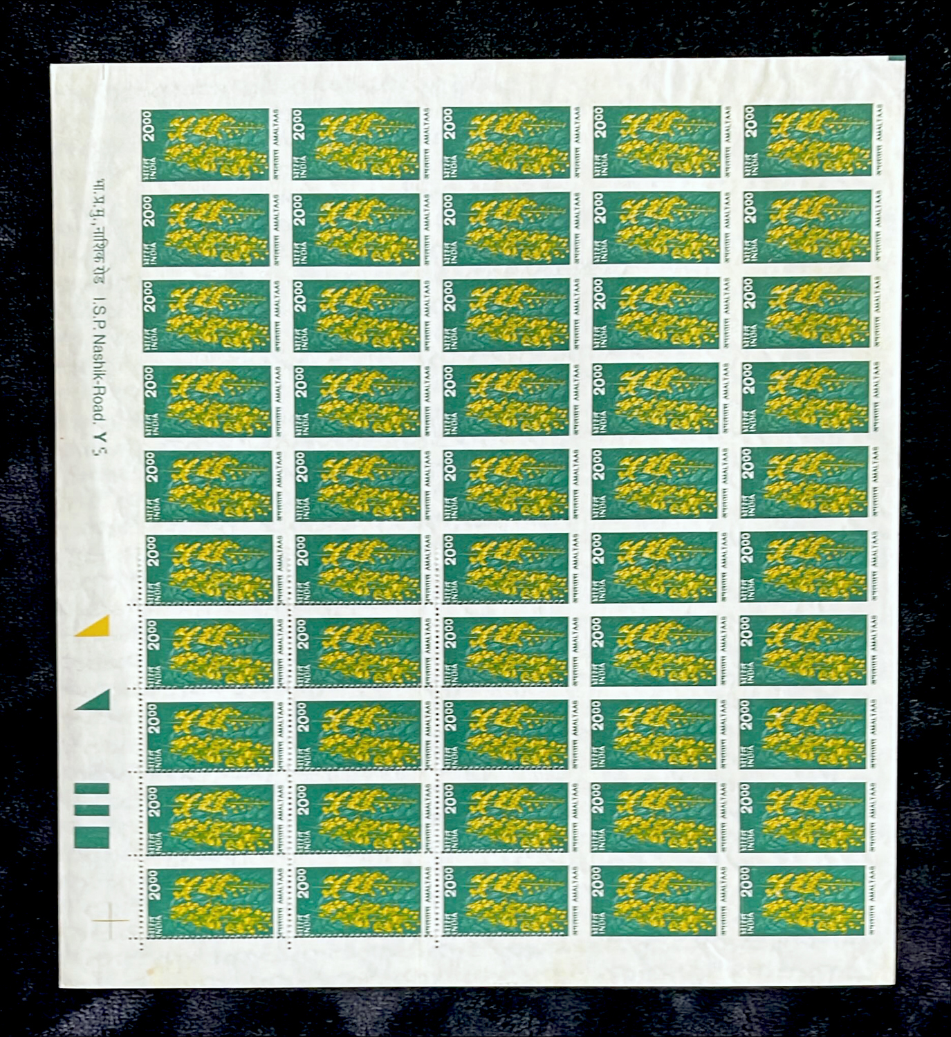 Wildlife Amaltas (plant) 20r complete sheet/50, variety: partially imperforate affecting most rows and columns, the perforated area being shifted as well, MNH. SG 1931var (Image) (Imageb)
