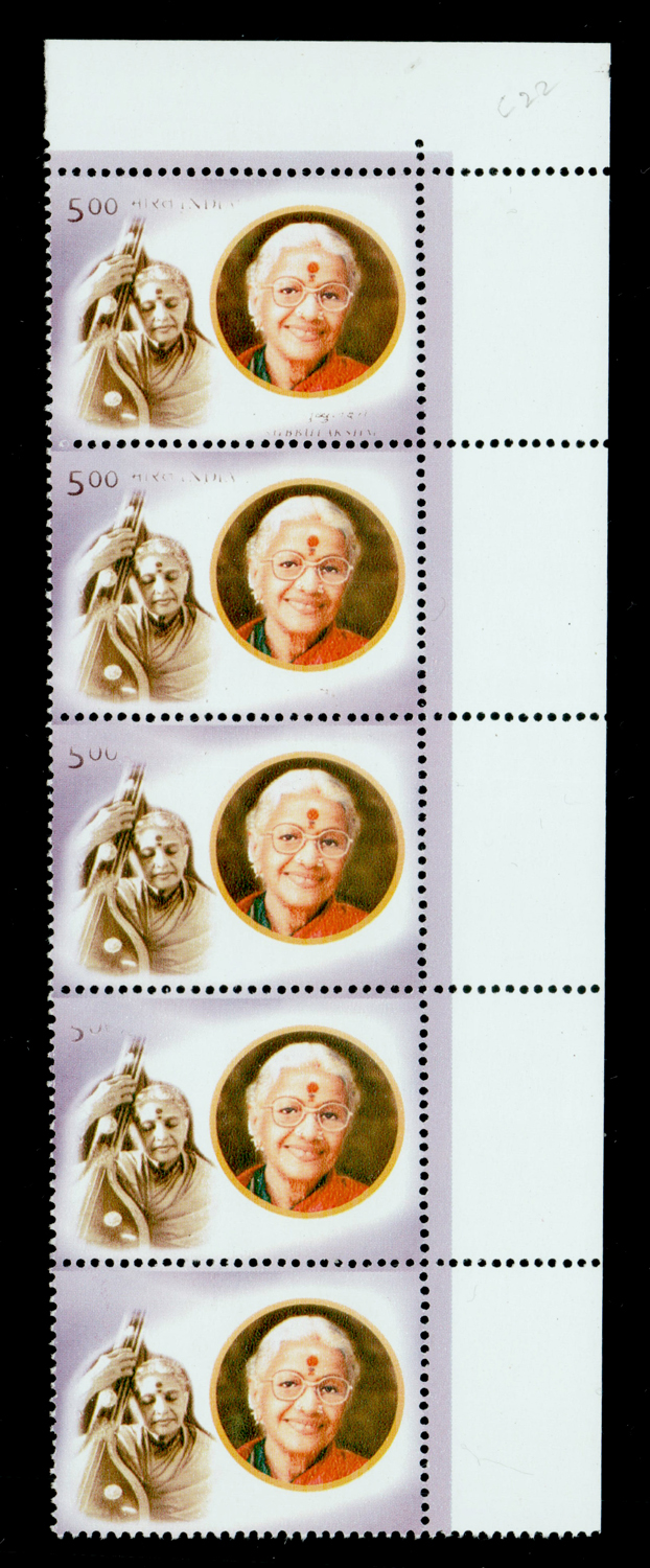 Subhalakshmi 5r, top right marginal strip/5, variety: black omitted progrssively from top to bottom, MNH. SG 2300var (Image) (Imageb)