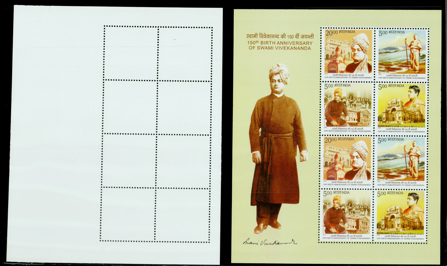 Anniversary of Swami Vivekananda 5r+20r, sheetlet of 8, variety: completely unprinted but perforated sheet, along with normal sheetlet for comparision MNH (2). SG 2914/2917var (Image) (Imageb)