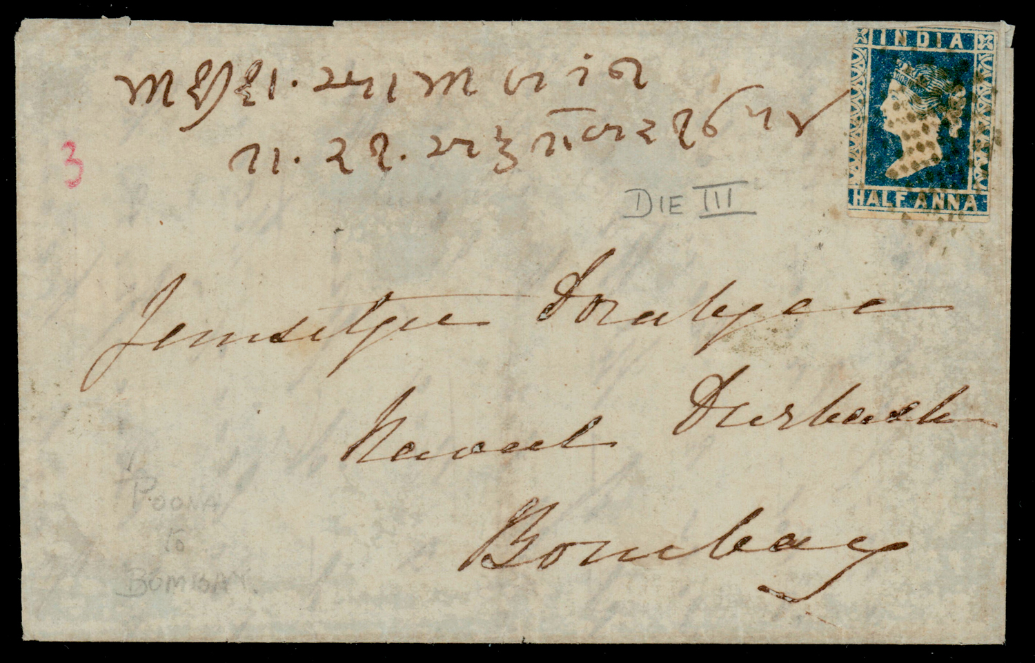 folded letter from Poona to Bombay f.w. ½a deep blue, die I, imperf, tied by diamond of dots. SG 4. Used during the first month of stamp issue