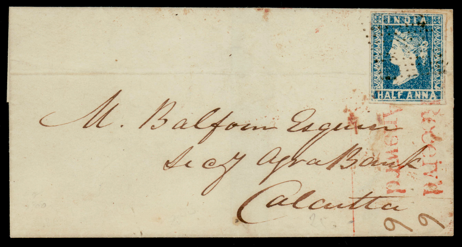 folded letter from Agra to Calcuta f.w. ½a deep blue, die I, imperf, tied by "1" type 5 of Agra. SG 4 (Image) (Imageb)