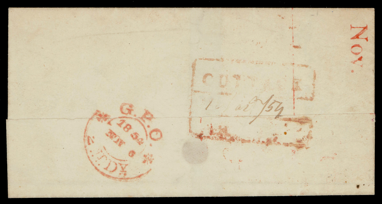 folded letter from Cuttack to Calcutta f.w. ½a blue, die I, imperf, diagonal line flaw, tied by diamond of dots. SG 2. Early usage