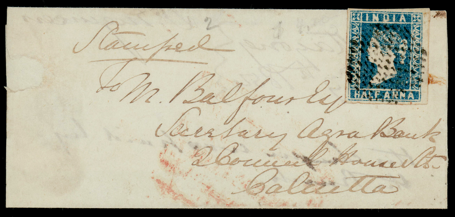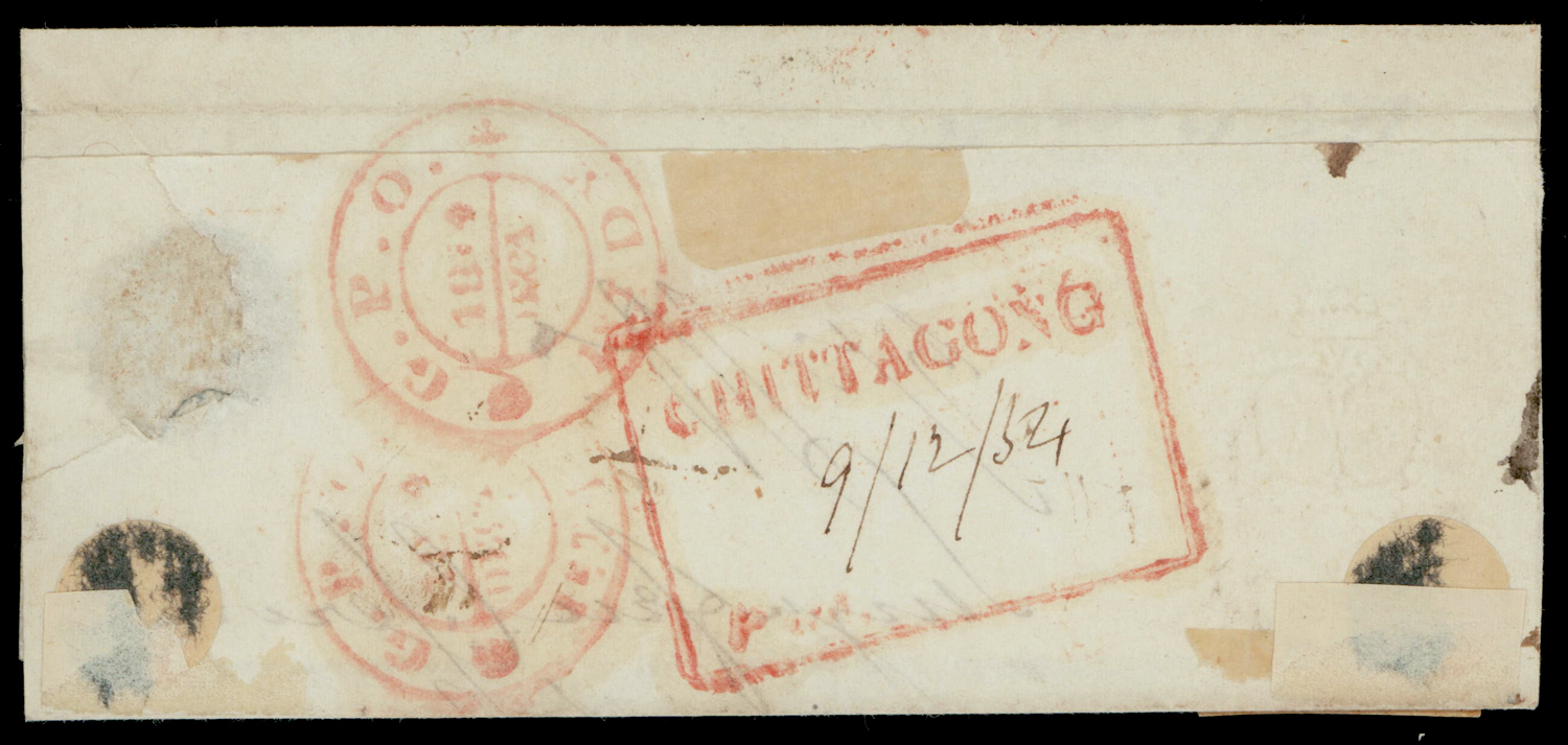 Cancellation: Cooper type 1c circle of dots cancel on 1854 ½a deep blue on 1854 (Dec 9) folded letter from Chittagong (now in Bangladesh) to Calcutta. SG 4 (Image) (Imageb)