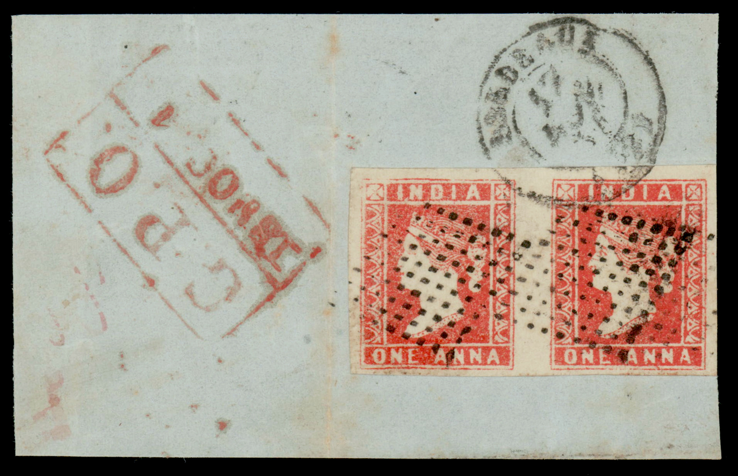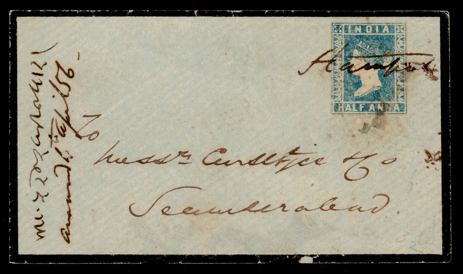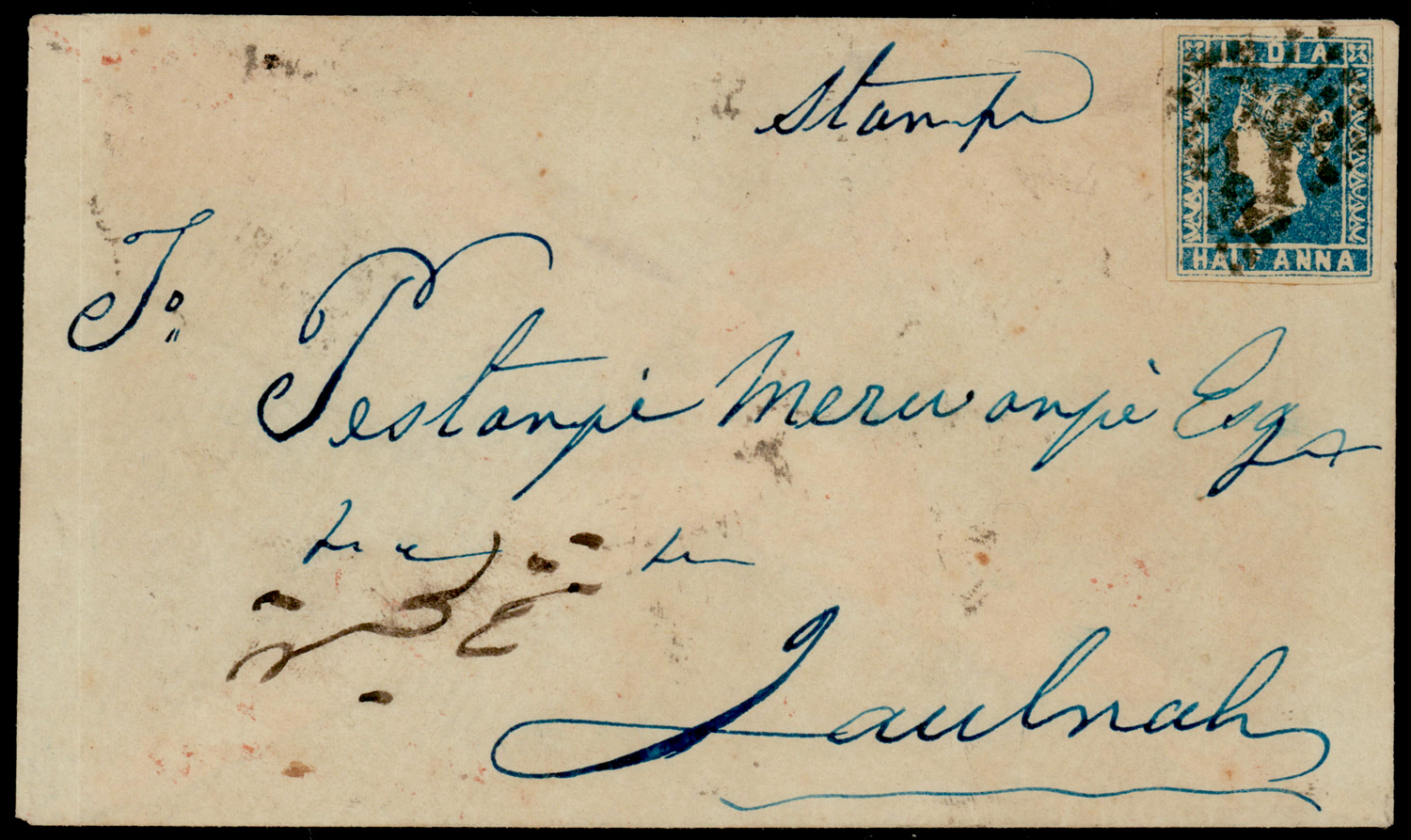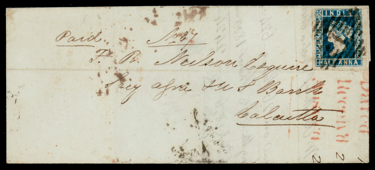 mourning cover from Moolegellah to Secunderabad f.w. ½a pale blue, die I, imperf, tied by diamond of dots cancel. SG 3 (Image) (Imageb)