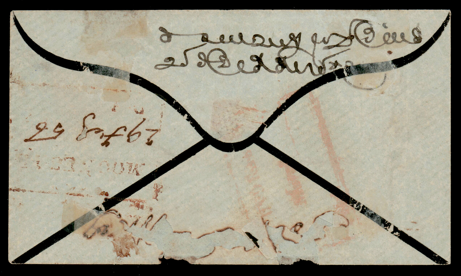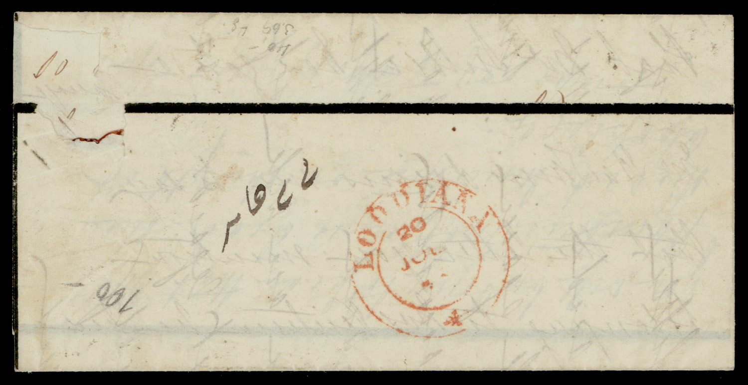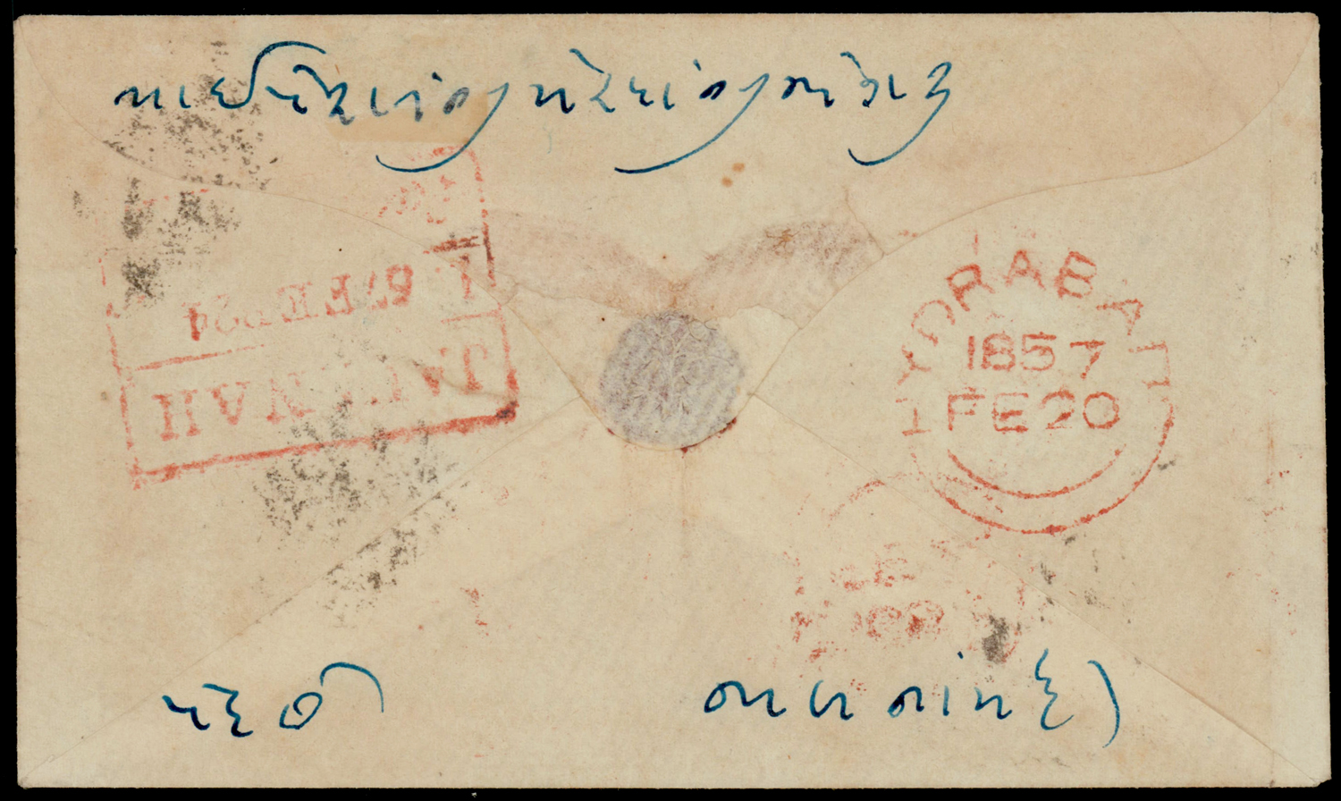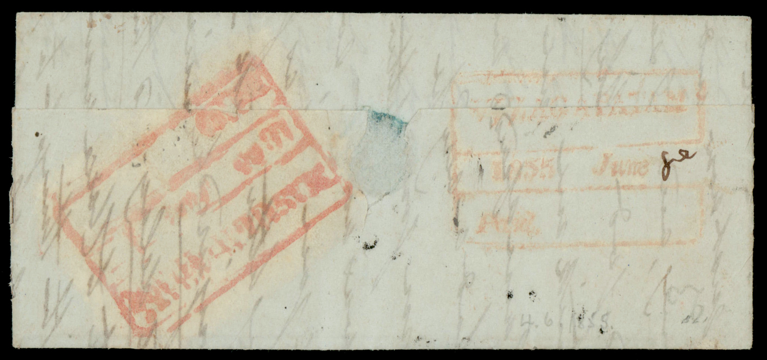 mourning cover from Moolegellah to Secunderabad f.w. ½a pale blue, die I, imperf, tied by diamond of dots cancel. SG 3 (Image) (Imageb)