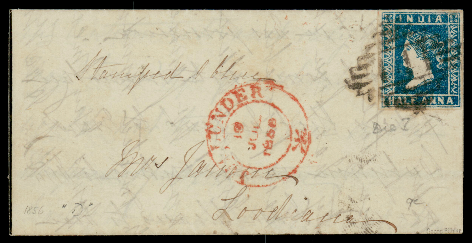 folded letter from Jullunder to Loodiana inscribed "Stamped 1 blue" f.w. ½a blue, die I, imperf, tied by "141" type 5 of Jullunder. SG 2. Signed Georg Buhler (Image) (Imageb)