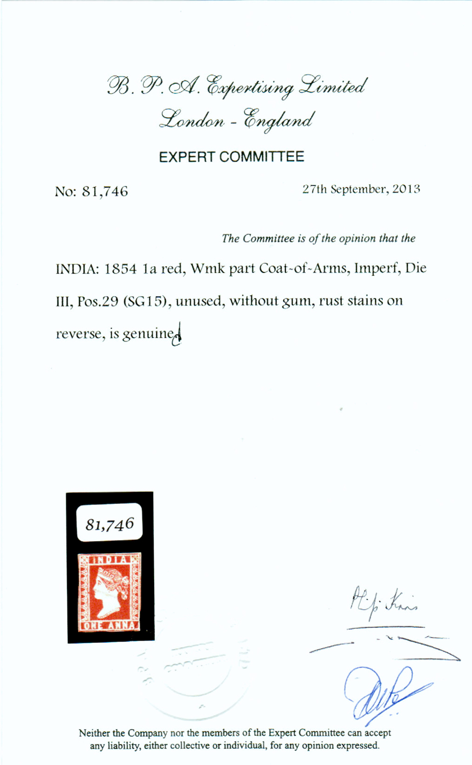 die III, imperf, Pos.29 unused, without gum as issued SG 15 £5,000 - 2013 BPA certificate (Image) (Imageb)