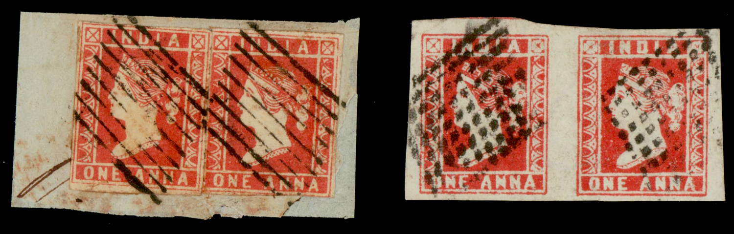 I, imperf x 2 singles on piece tied by diamond of bars cancel. Also die II pair with diamond of dots cancel. SG 11/14 (Image)