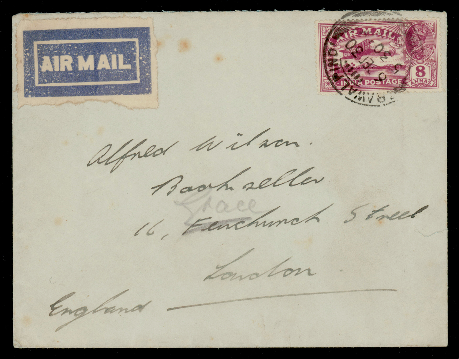 Airmail, variety: comma in bottom loop of "8", Dave type 1, on cover from Rawalpindi to London (Image) (Imageb)