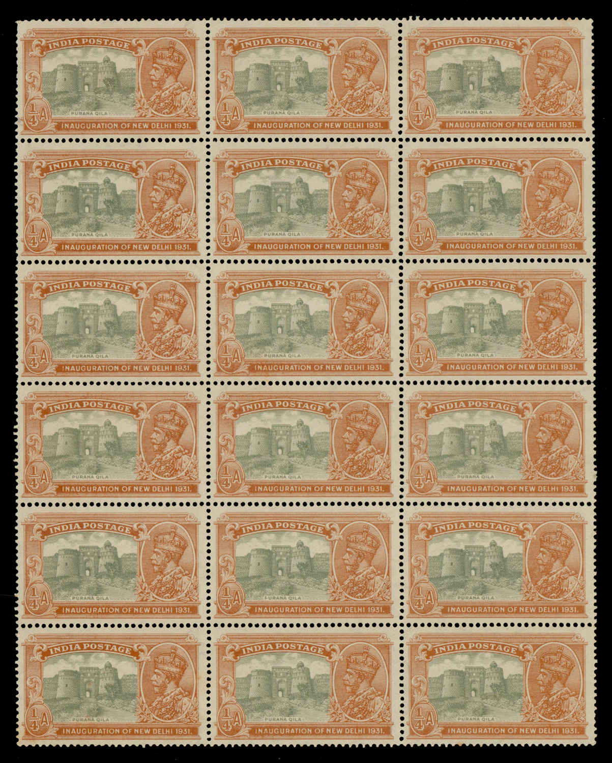 Inauguration of New Delhi, blk/18, variety: "F" for "P" in PURANA in R5/2, MNH, toned and minor perf split. SG 226a £390++ (Image)