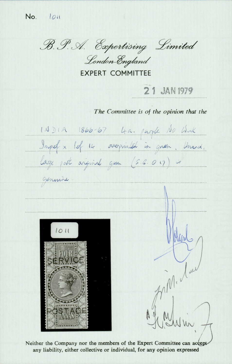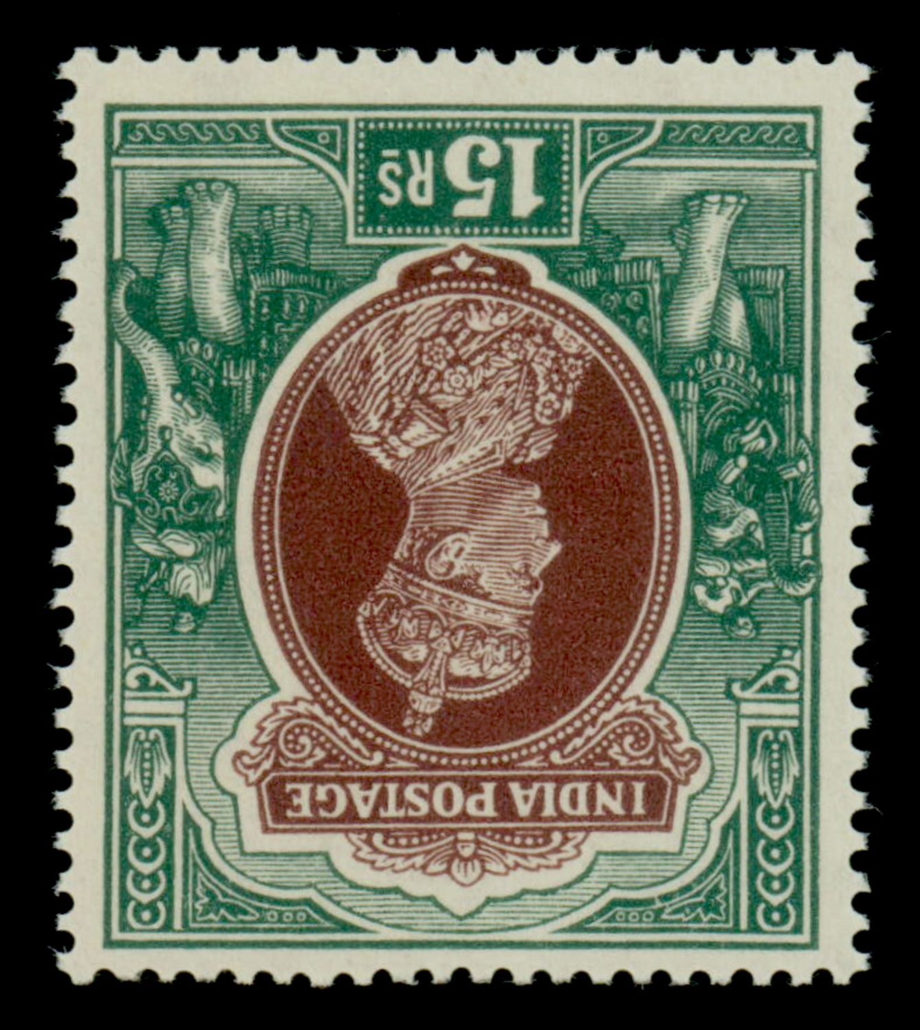 green, ovpt. Small Service on elephant's head watermarked paper, unused. SG O13 £600 (Image)