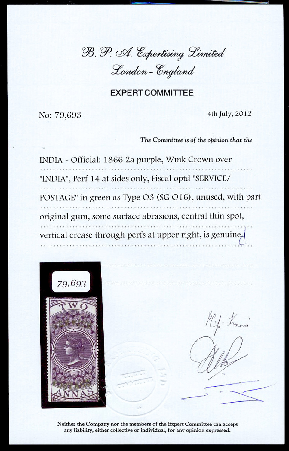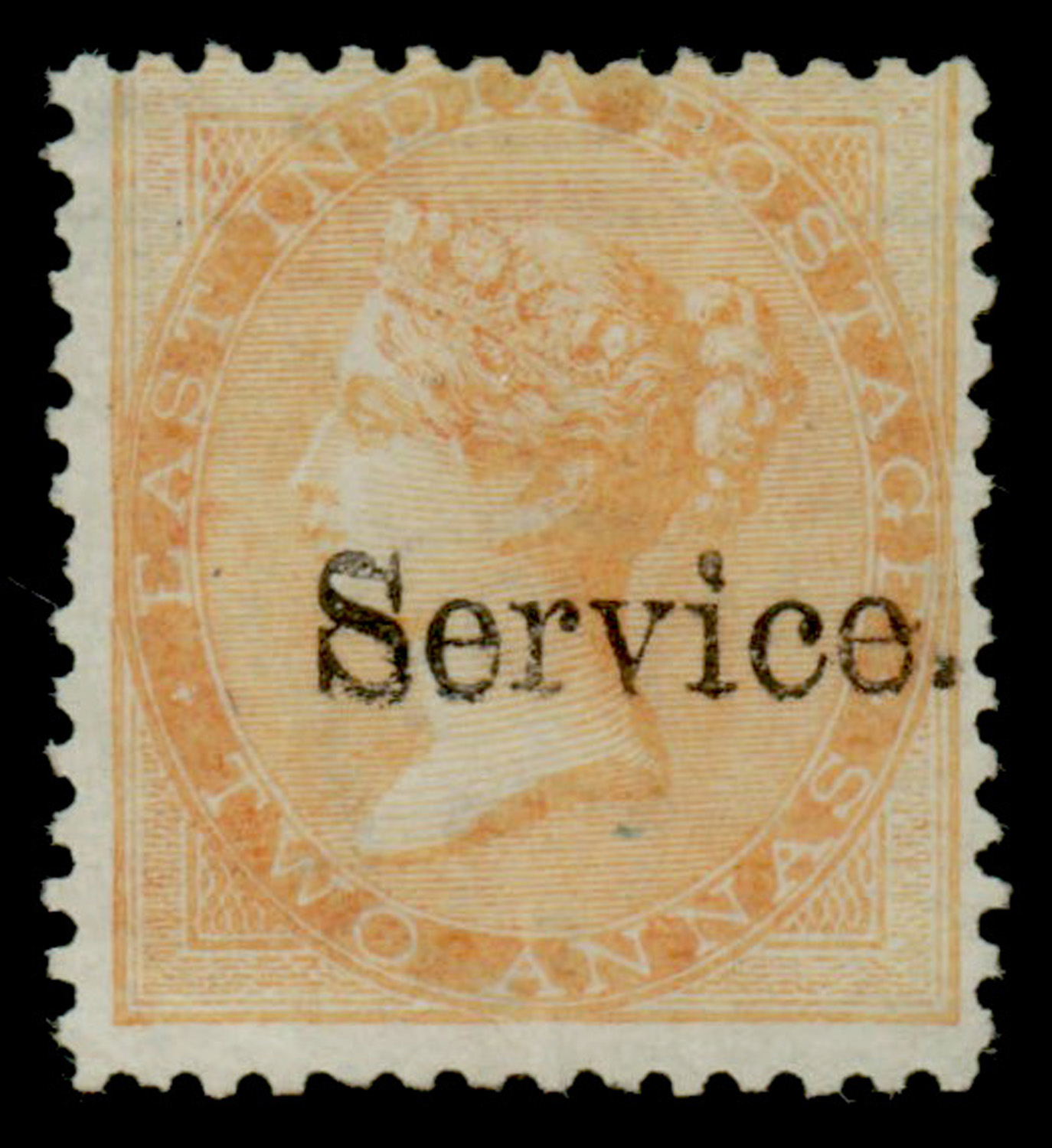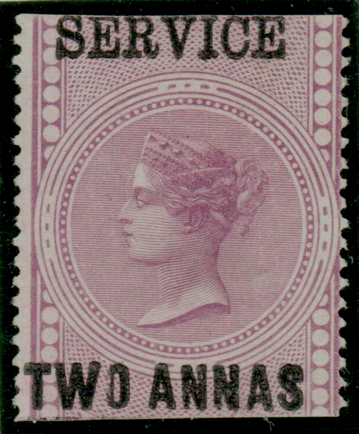 ovpt SERVICE/TWO ANNAS in black, unused, exceptionally fresh and fine. SG O15 £1,100 (Image)