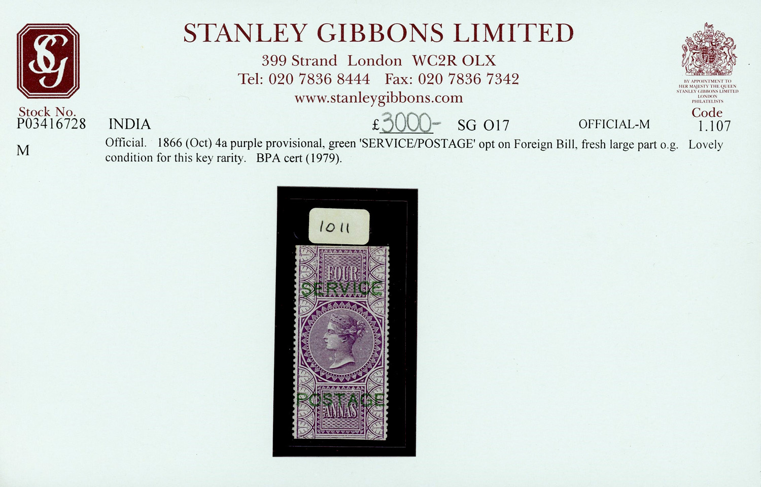 Foreign bill ovpt SERVICE/POSTAGE in green as type O4, mint, extremely fresh and fine, entirely free from the usual surface abrasions and cracks which plague these issues, complete perforations. SG O17 £12,000 (Image) (Imageb)
