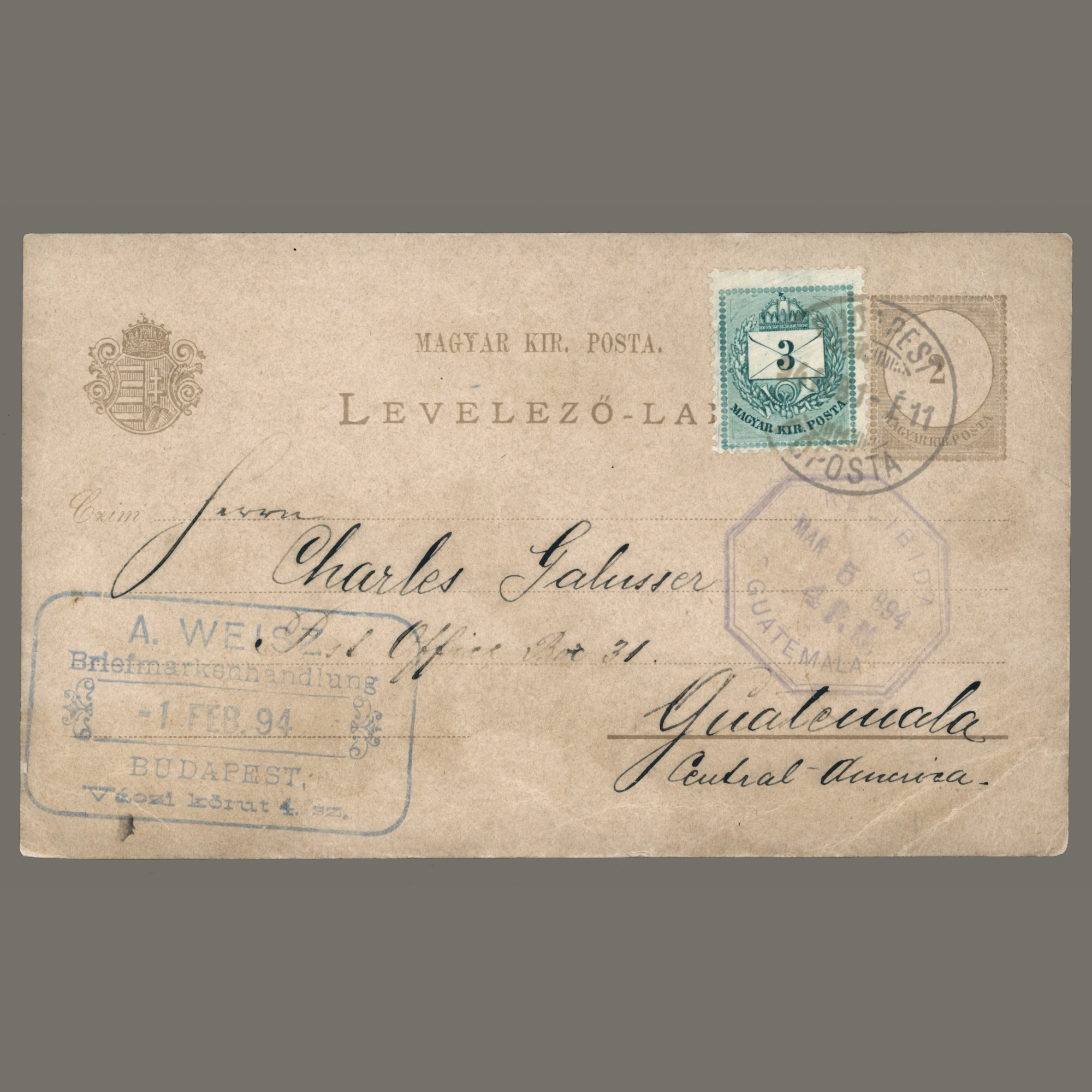 1894 Hungary - Postal stationery sent to Guatemala with 3 kr (1881) additional postage - rare destination | Autograph