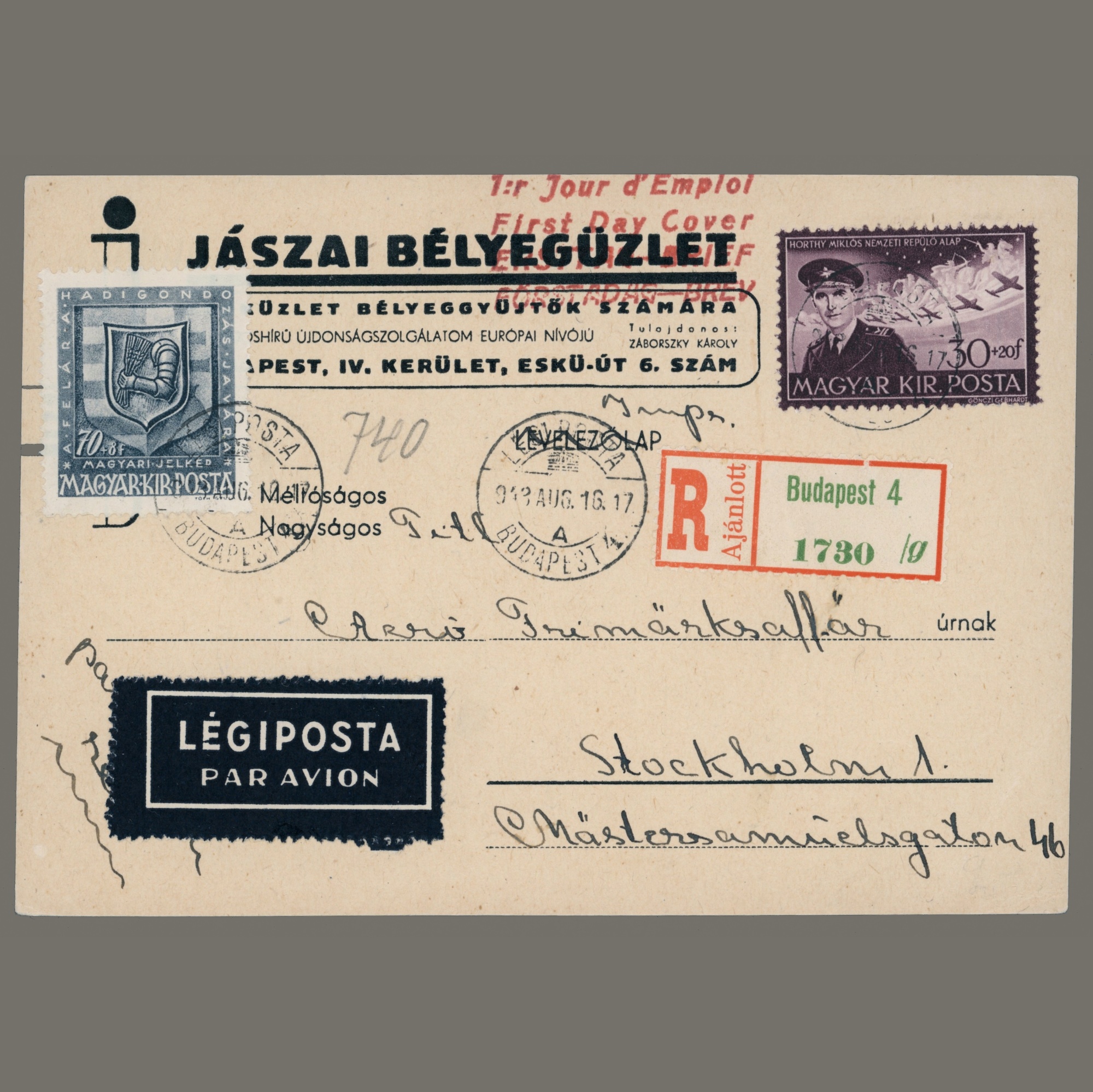 1943 Hungary - Flying Fund V. / István Horthy rare early FDC on a registered postcard sent to Sweden(Image 1)