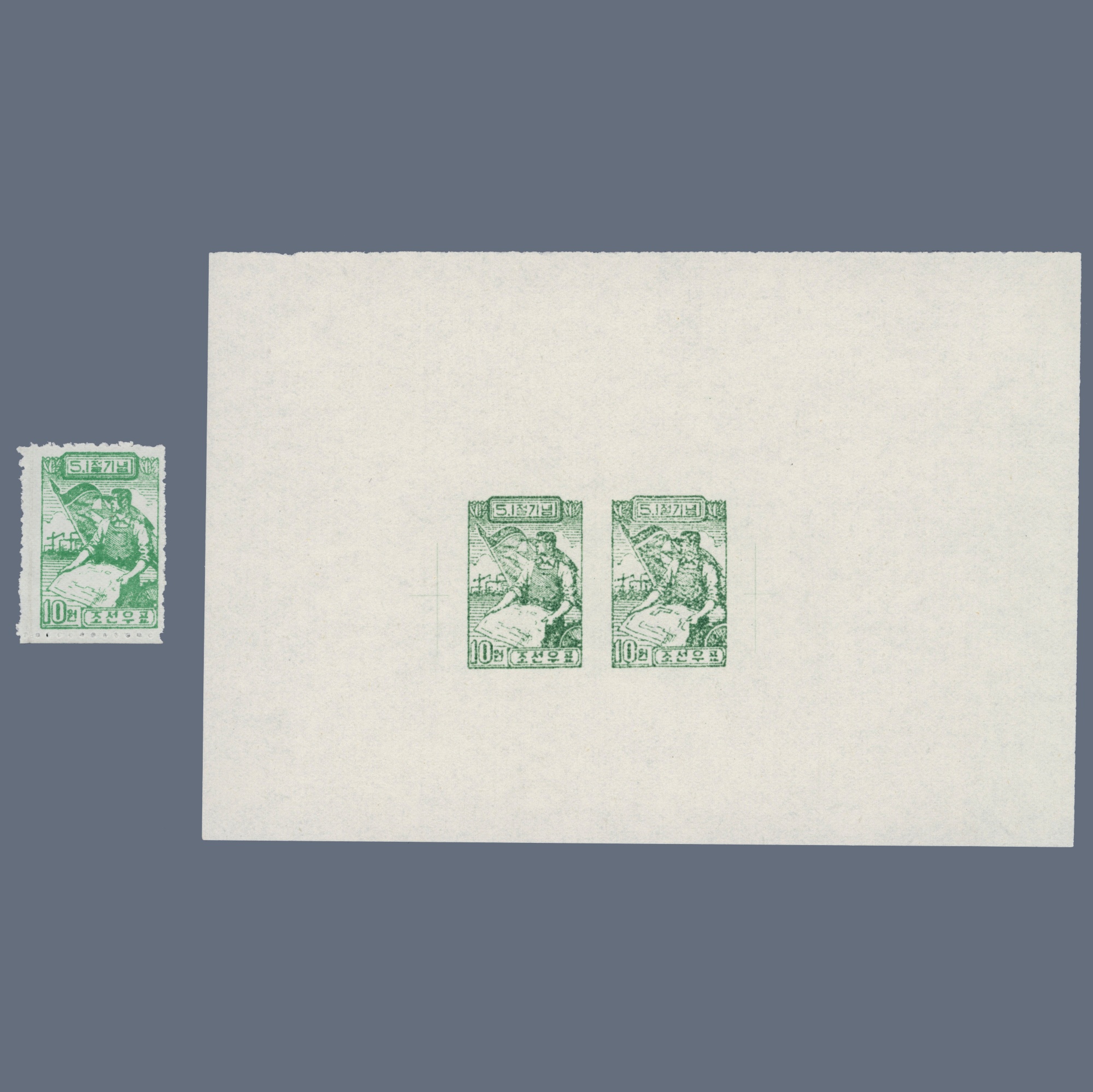 1955 North Korea - two picture proof of the „May Day” green 10 won stamp and a perforated stamp | It's not a reprint.(Image 1)