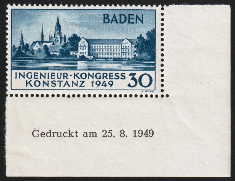 5N41, 5N41a Engineering Congress 30pf dark blue, both printings as LR corner singles w/ print date in selvage; cheaper Type I is hinged, RARE Type II is NH (Michel 46 I Br u, 46 II Br u); VF....Euro 4,090 LE