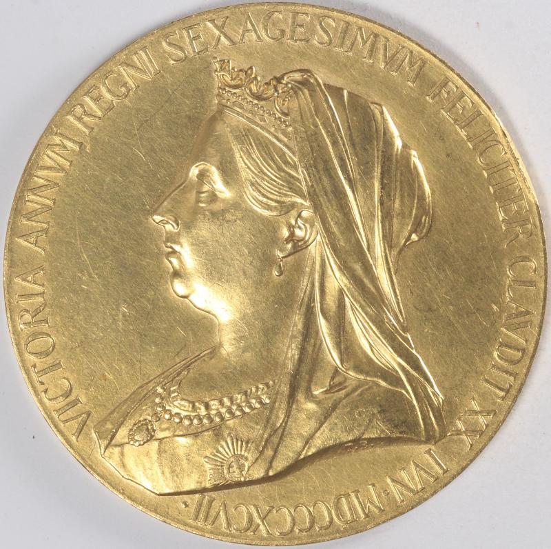 Lot 356 - Great Britain 1897 Queen Victoria Diamond Jubilee, Royal Mint official gold medal, 56mm, approx 93 grams 22k gold (AGW 2.74 toz); obv young queen of 1837, rev queen in 1897; evidence of some handling incl edge indentation @ 2o'clock; only 3,725 produced, very attractive!.... Est. US$10,000-12,000 HWC-SE Currently US$ 9,800