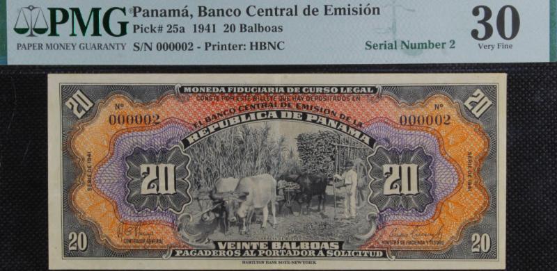 Lot 365 - Panama 1941 20 balboas, 2025 PMG Graded 30 VF Ink, Serial Number 000002, the lowest known for this note; would have graded higher but for some stray violet ink on reverse; Pick #25a, most notes were destroyed after a coup d'état; RARE.... Est. US$18,000-20,000 HWC-SE Currently US$ 16,000