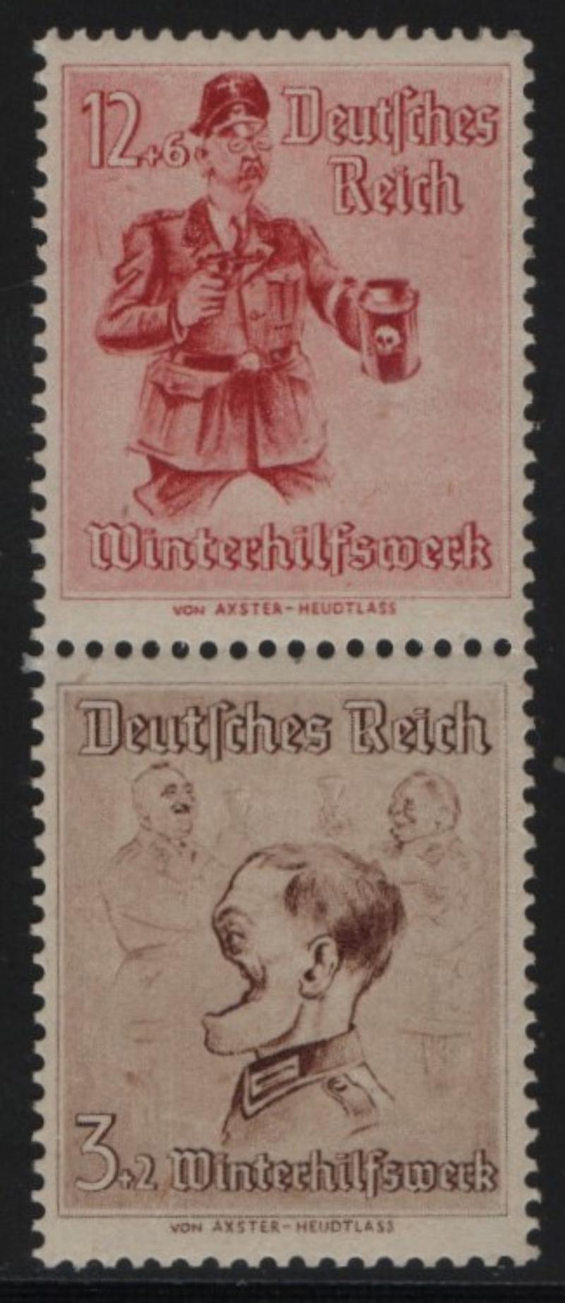 British WWII propaganda stamps, V pair Winterhilfswerk stamps, 3+2pf soldier w/ face shot off, Göring in background and 12+6pf Himmler collecting for charity at gunpoint; perf, full OG NH VF (Michel 30-31) (Image)