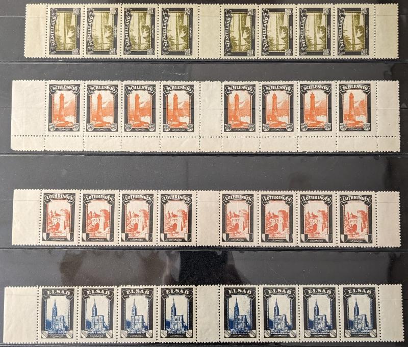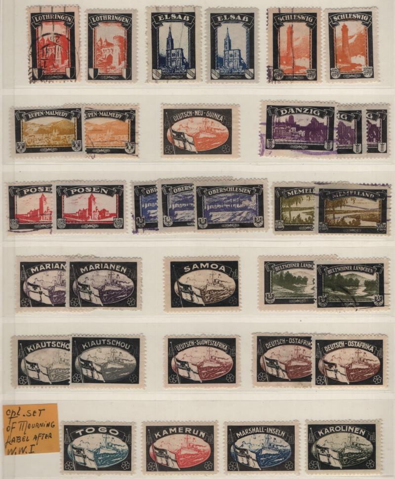 Mourning labels (colonies & territories) incl multiples, gutters & several different versions of the souvenir page, also a booklet by dealer Peter "Document of an Insane Time" w/ examples of Inflation stamps and his mourning labels; set of (10)
