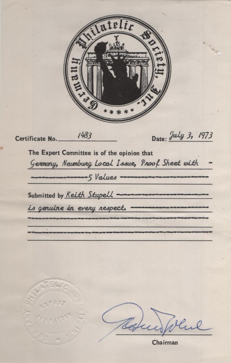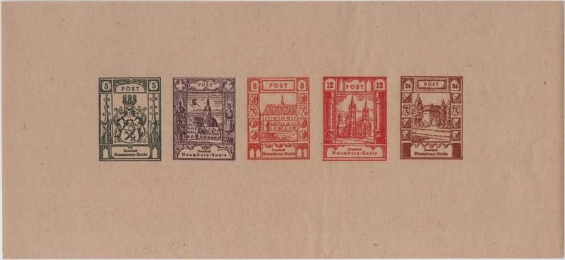 NAUMBURG Proof sheet of (5) diff unissued Locals, pictorial designs 5pf, 6pf, 8pf, 12pf and 24pf, imperf, full OG NH (Michel Bl. I P 3) 1973 GPS Cert; VF (Image) (imageb)